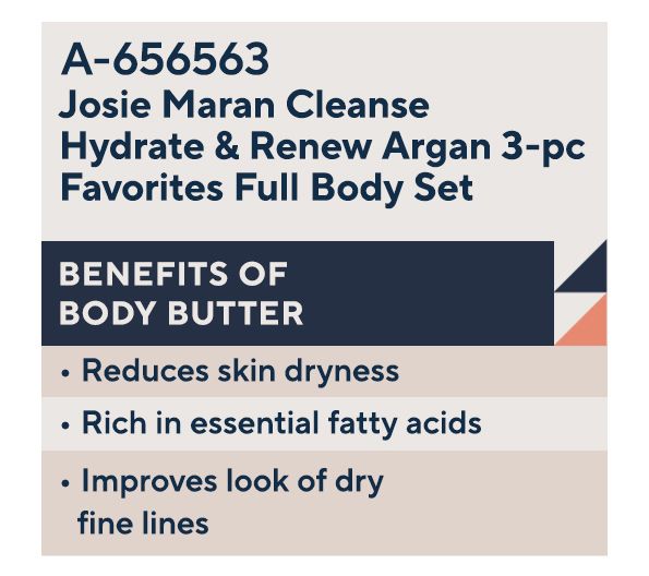 Whipped Argan Oil Body Butter is formulated with Josie's signature argan oil and is whipped to creamy perfection to help provide skin with hydration, helping to improve the look of dry, fine lines.