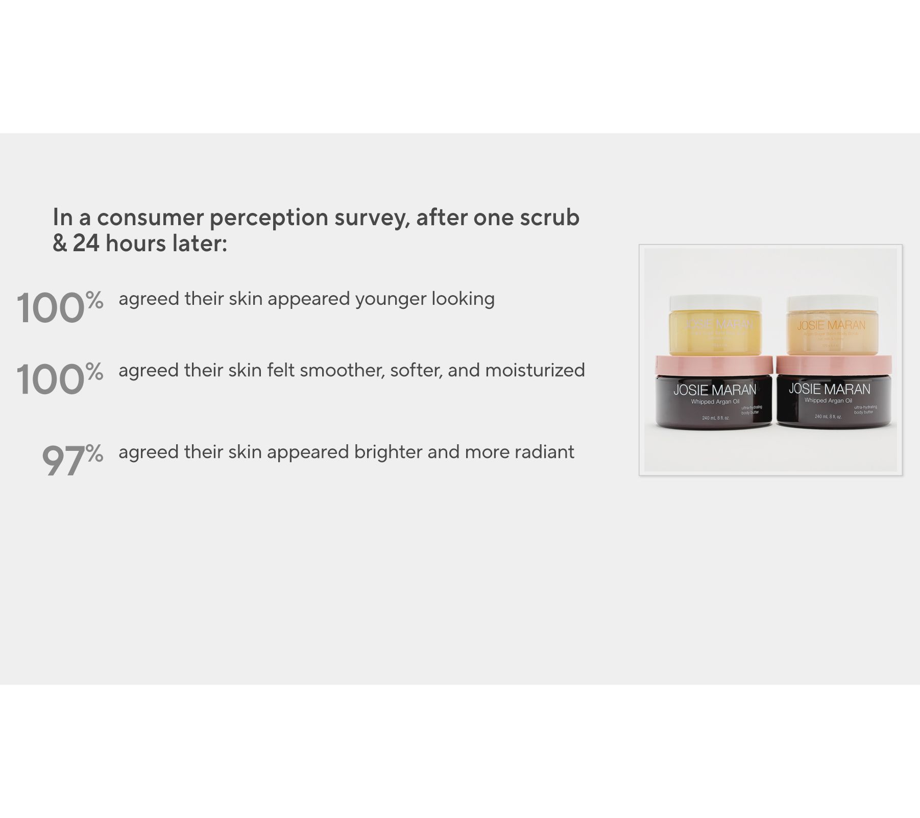 In a Consumer Perception Survey, 24 hours later: - 100% agreed their skin felt smoother, softer, and moisturized. - 97% agreed their skin appeared brighter and more radiant.