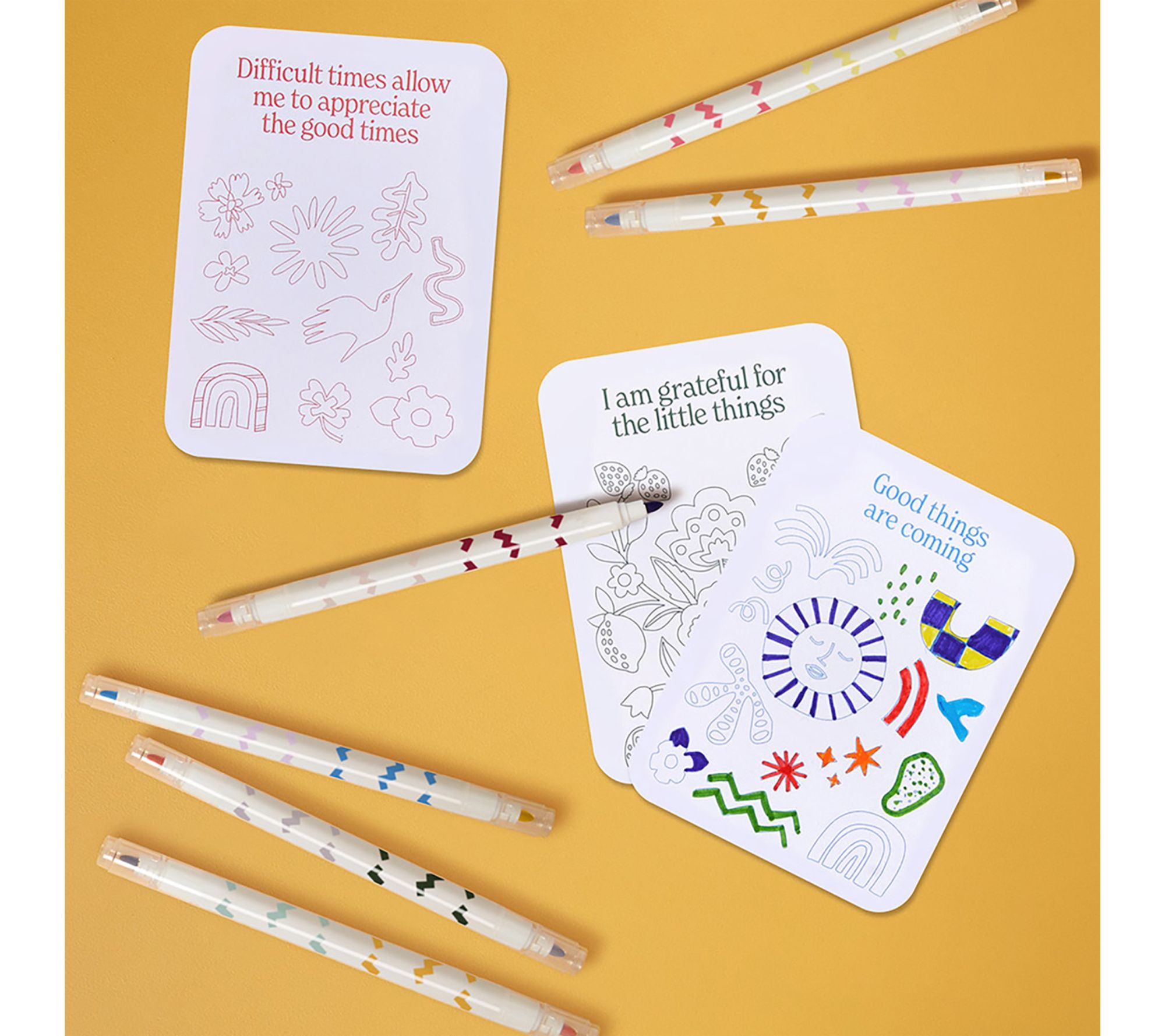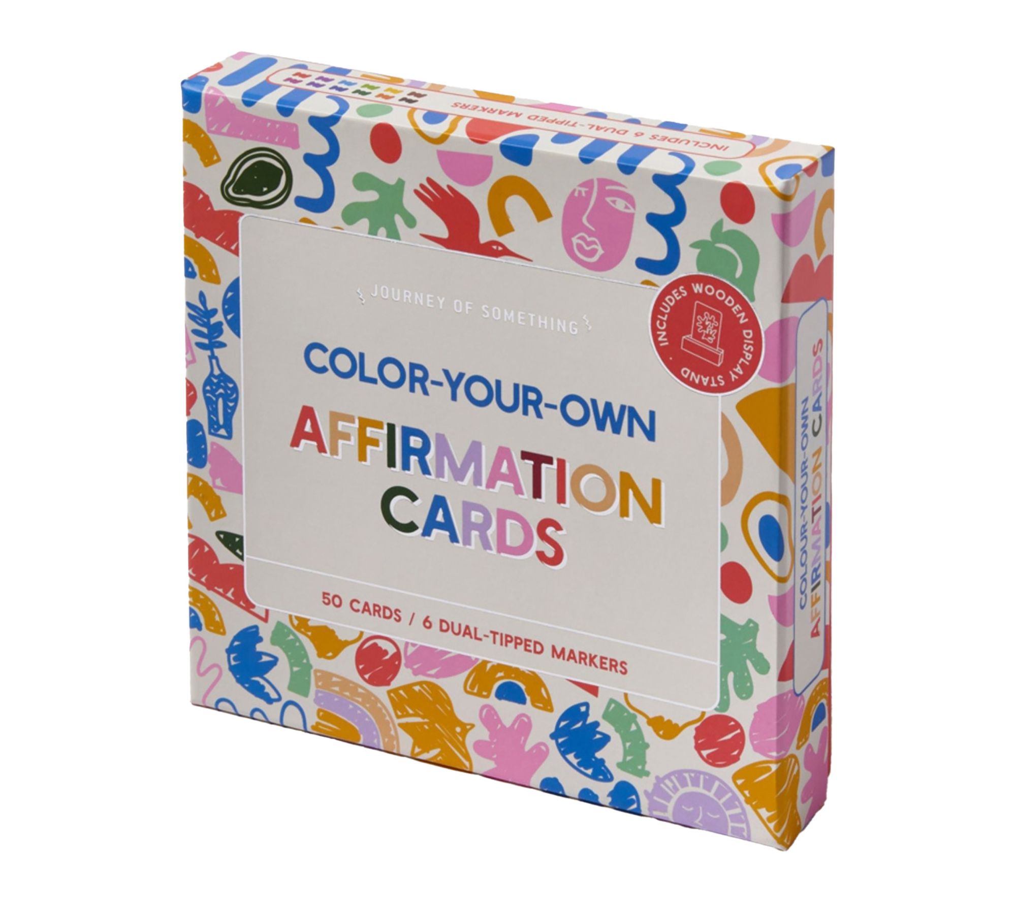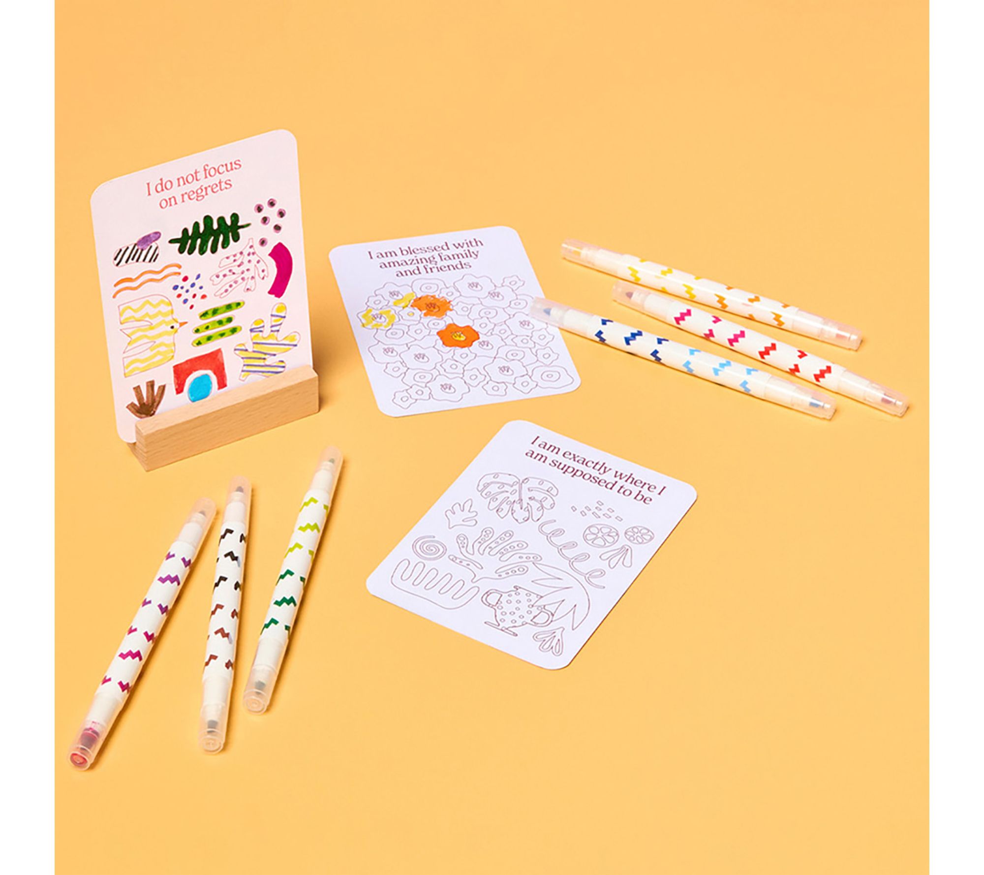 Includes 50 color-your-own affirmation cards, six dual-tipped markers, and one wooden display stand