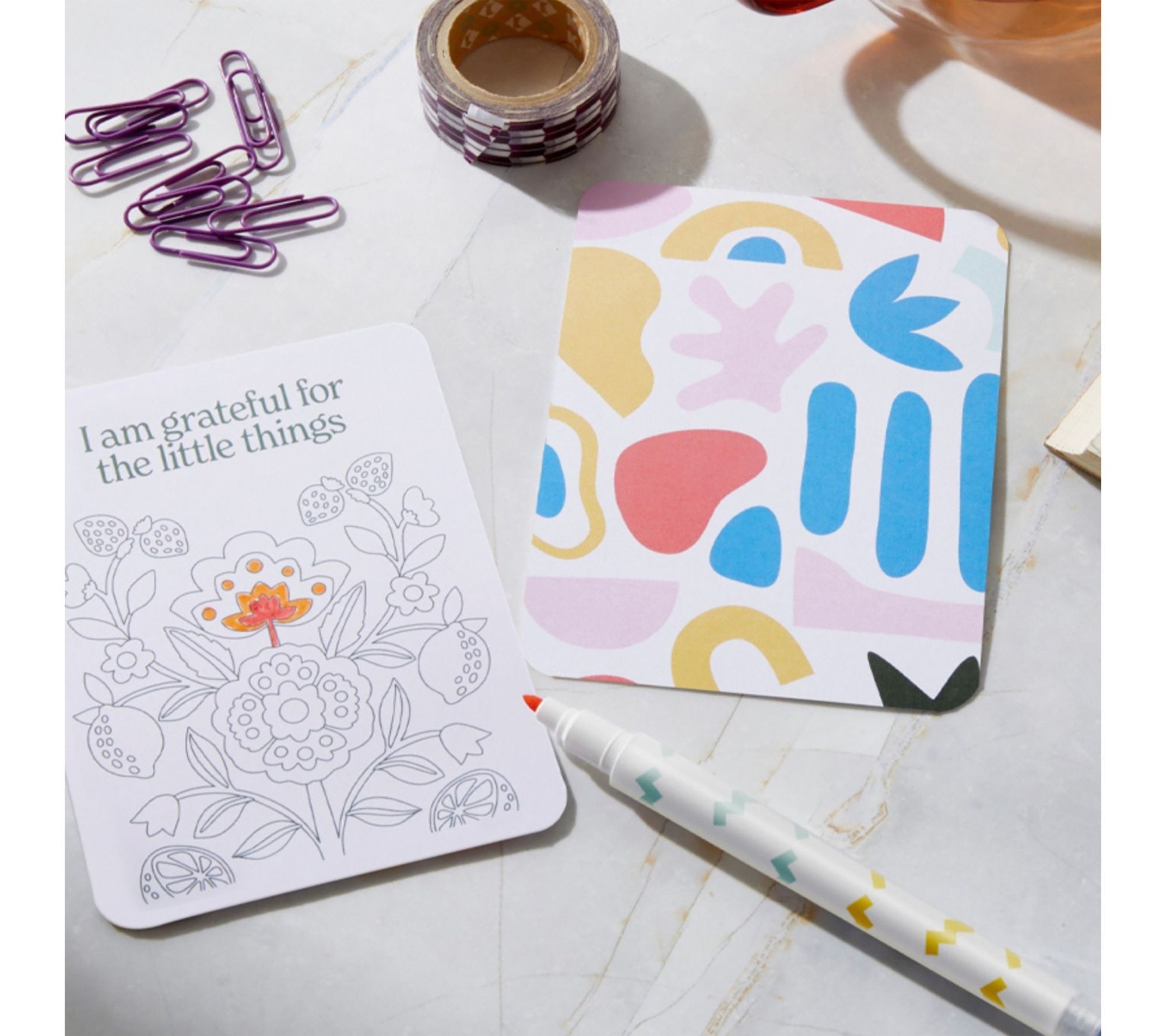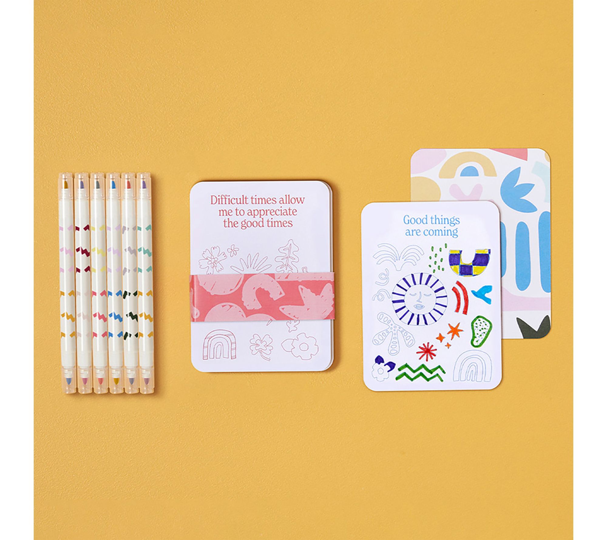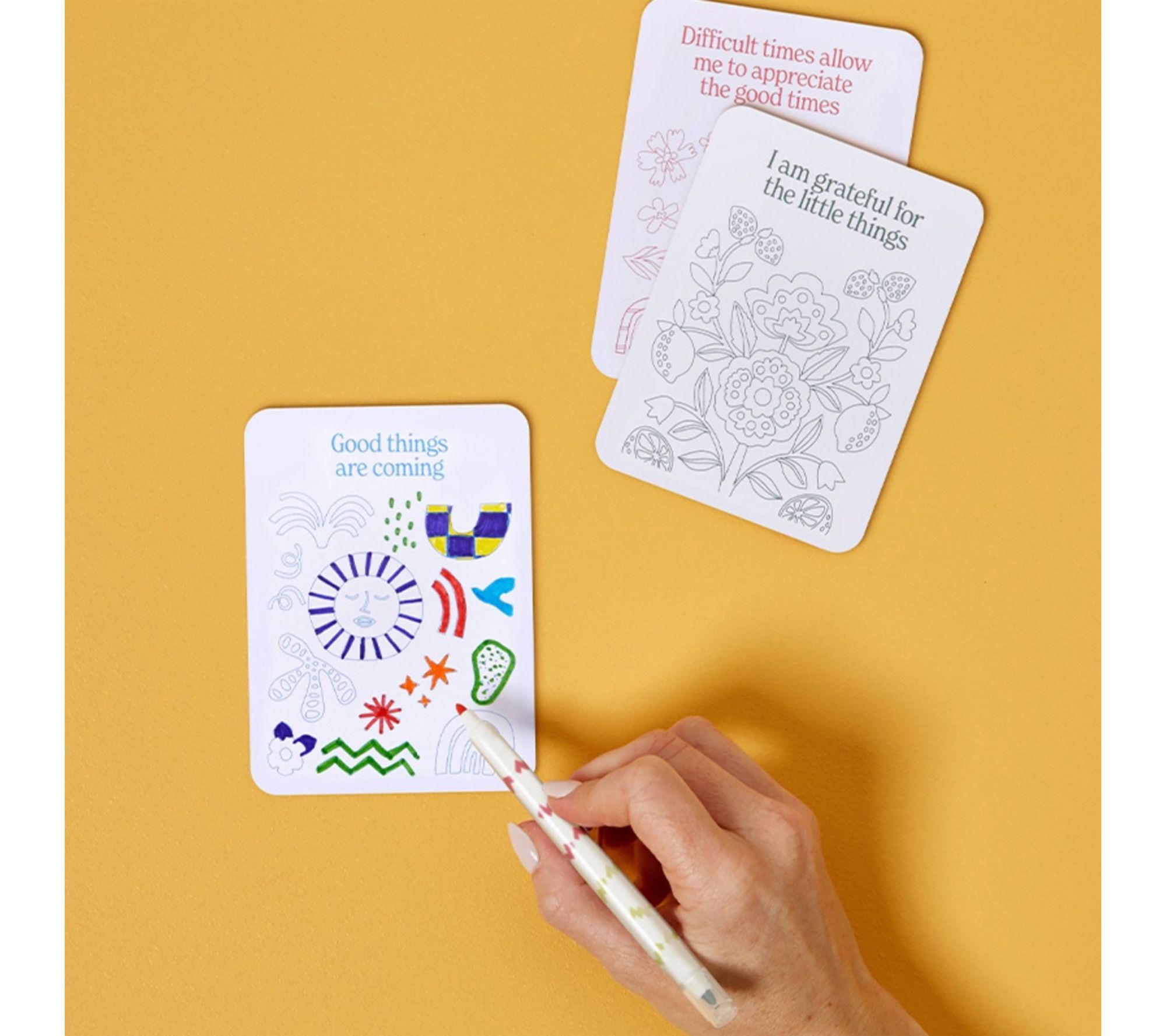 Includes 50 color-your-own affirmation cards, six dual-tipped markers, and one wooden display stand