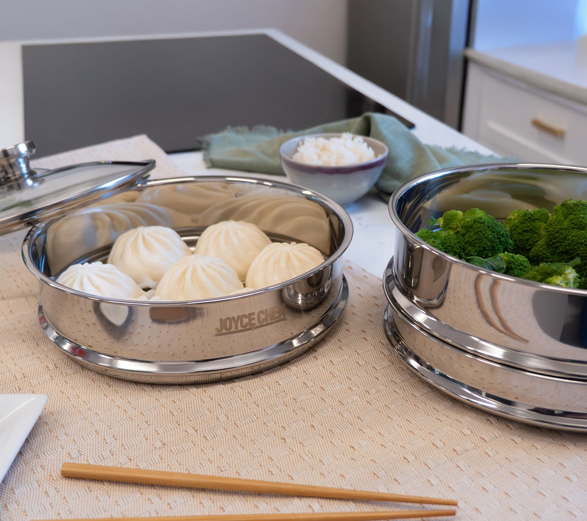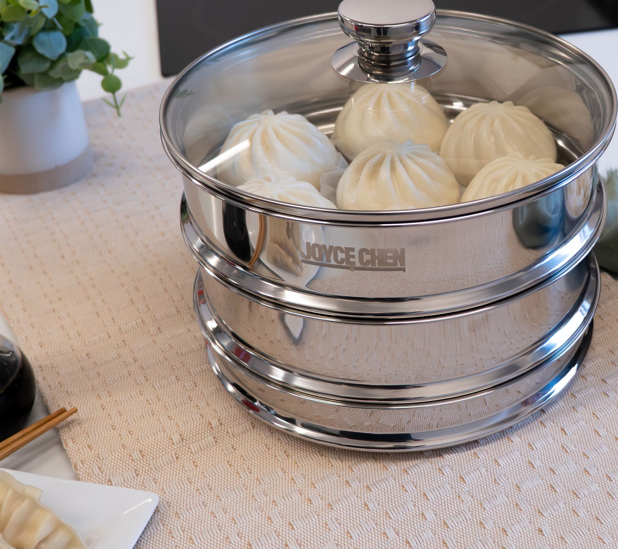 From plump dumplings to tender veggies, savor the flavors of steamed dishes prepared with this 2-tier stainless steel steamer. Easily layer your favorite ingredients for a complete meal, while the clear glass lid lets you keep an eye on things without releasing precious steam. From Joyce Chen.