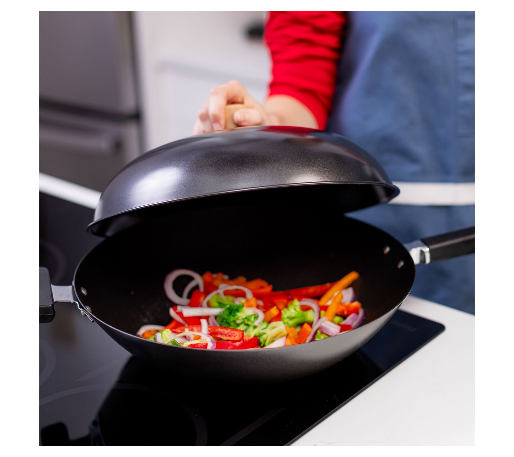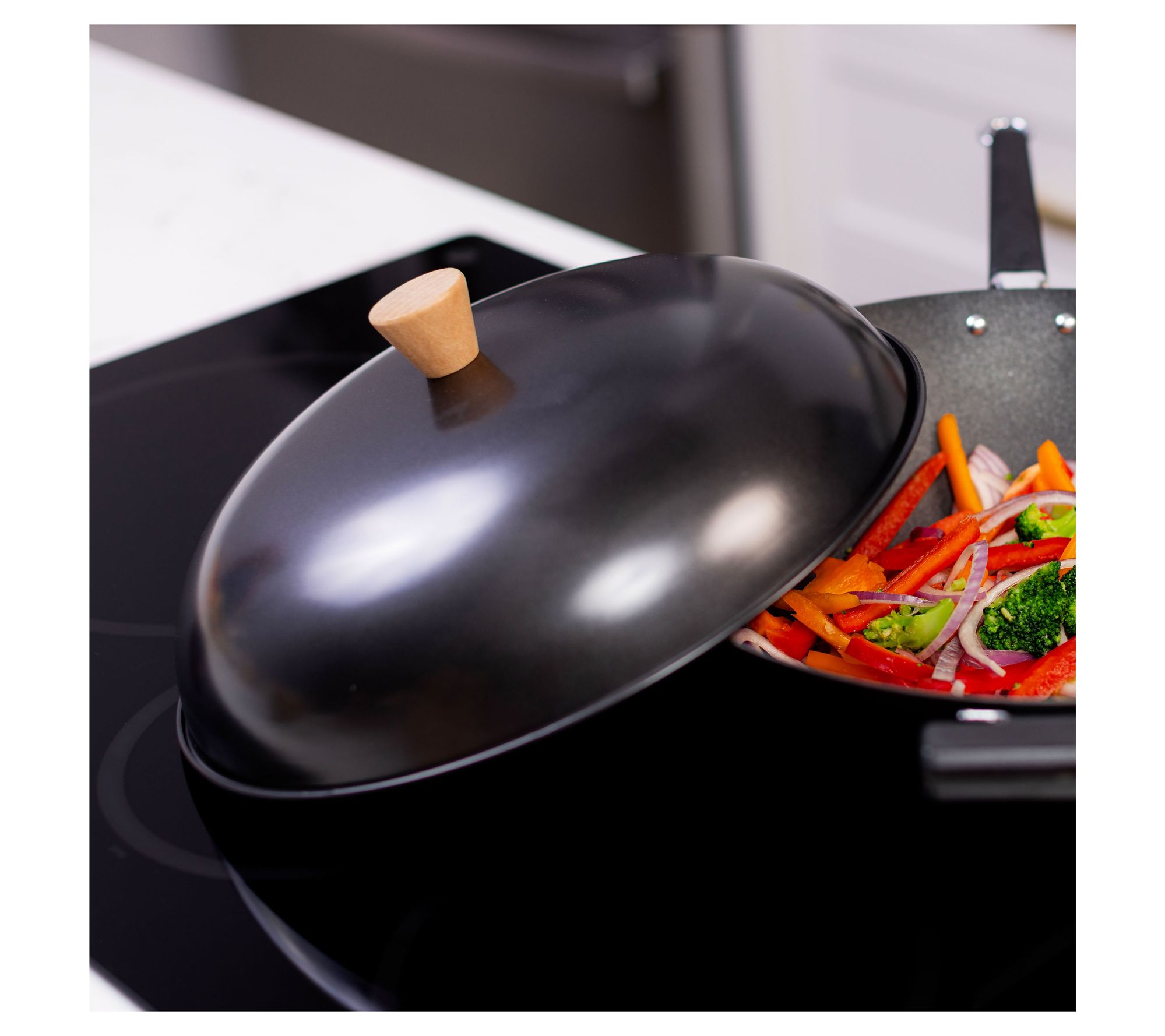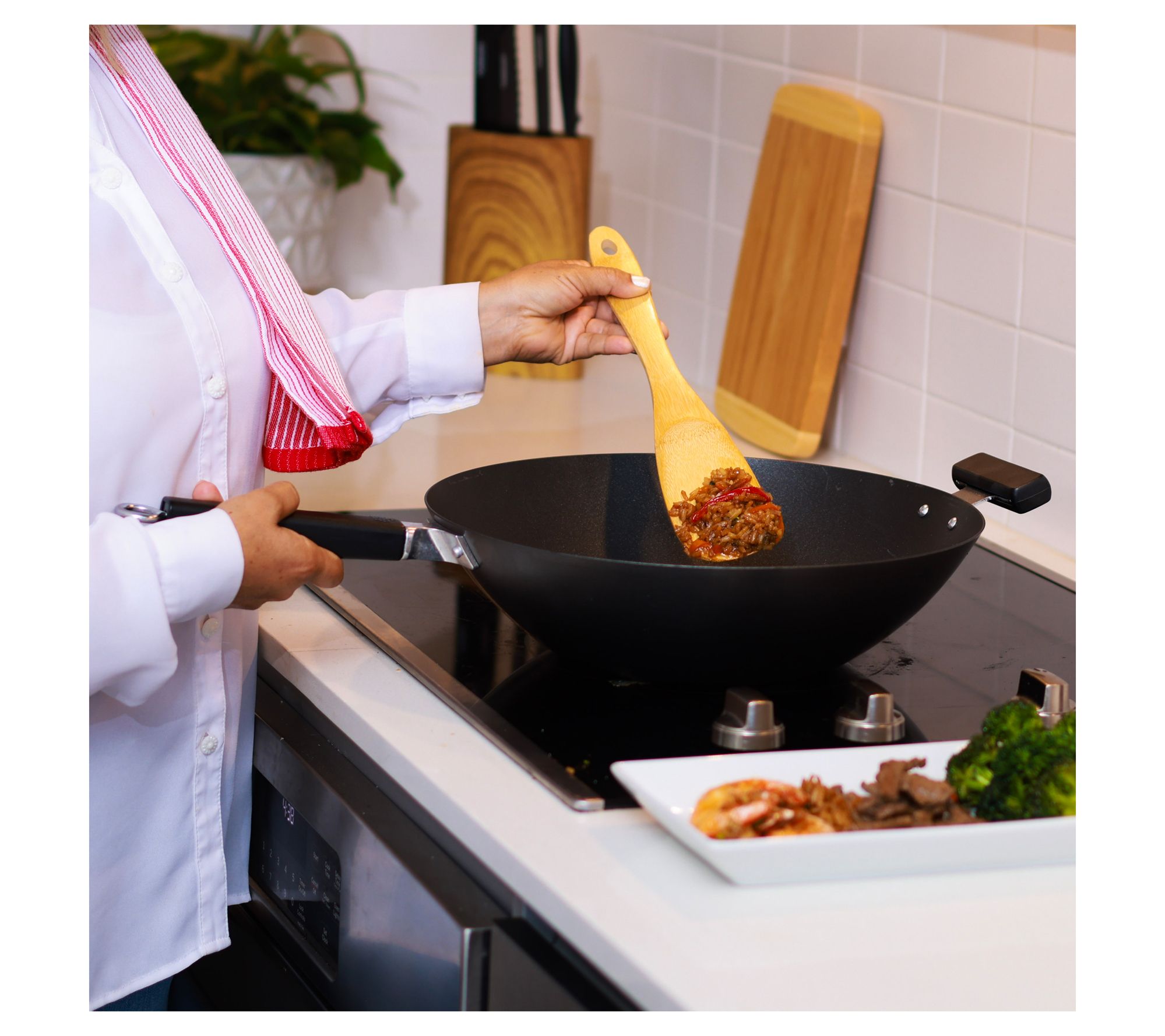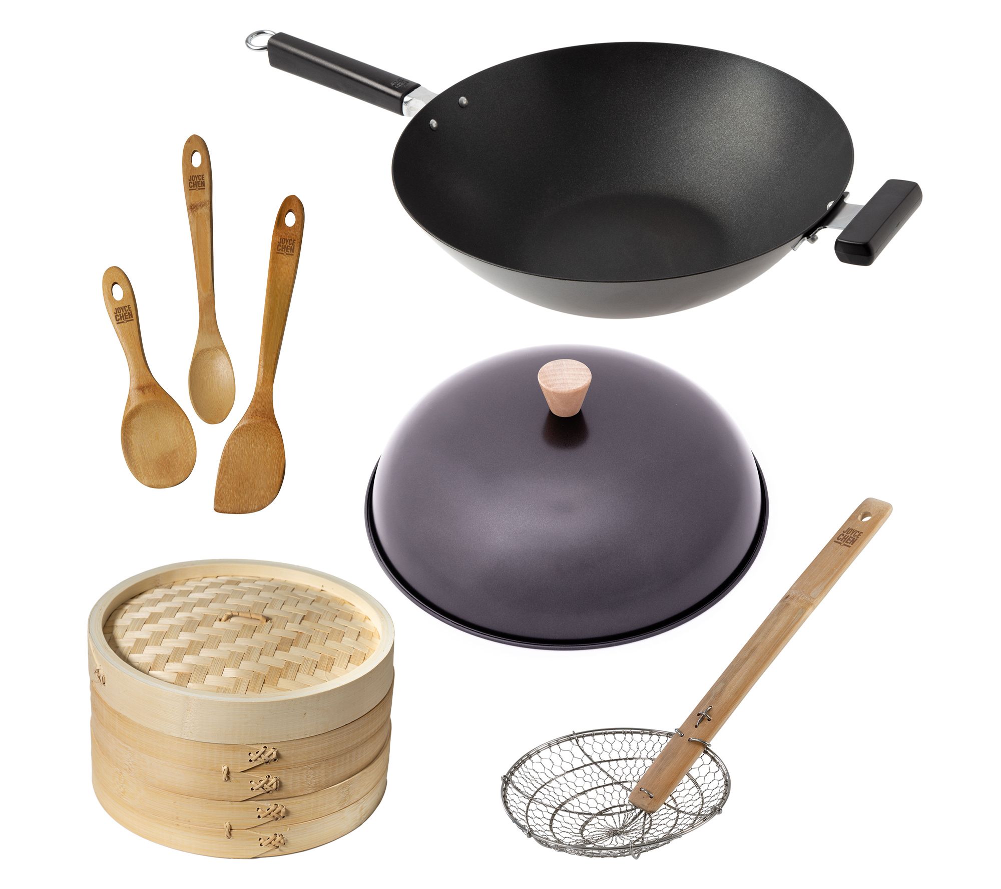 Includes one 14" wok, one 10" bamboo steamer basket, one wok lid, one spider strainer, one bamboo stir fry spatula, one bamboo mixing spoon, and one bamboo rice paddle