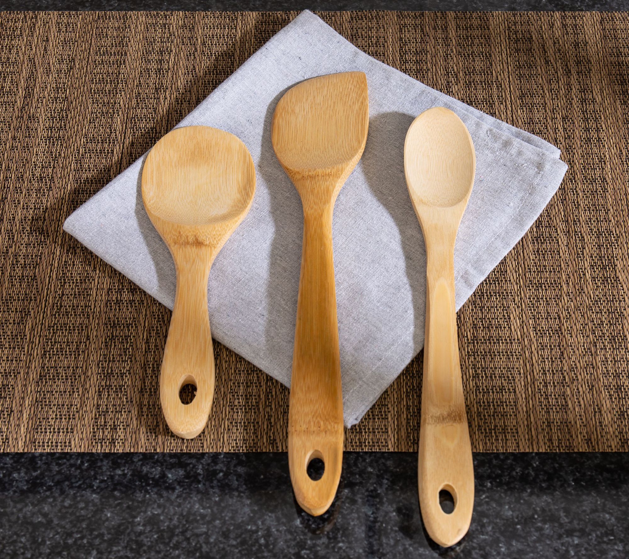 Steamer basket and lid, spatula, spoon, and rice paddle: bamboo construction