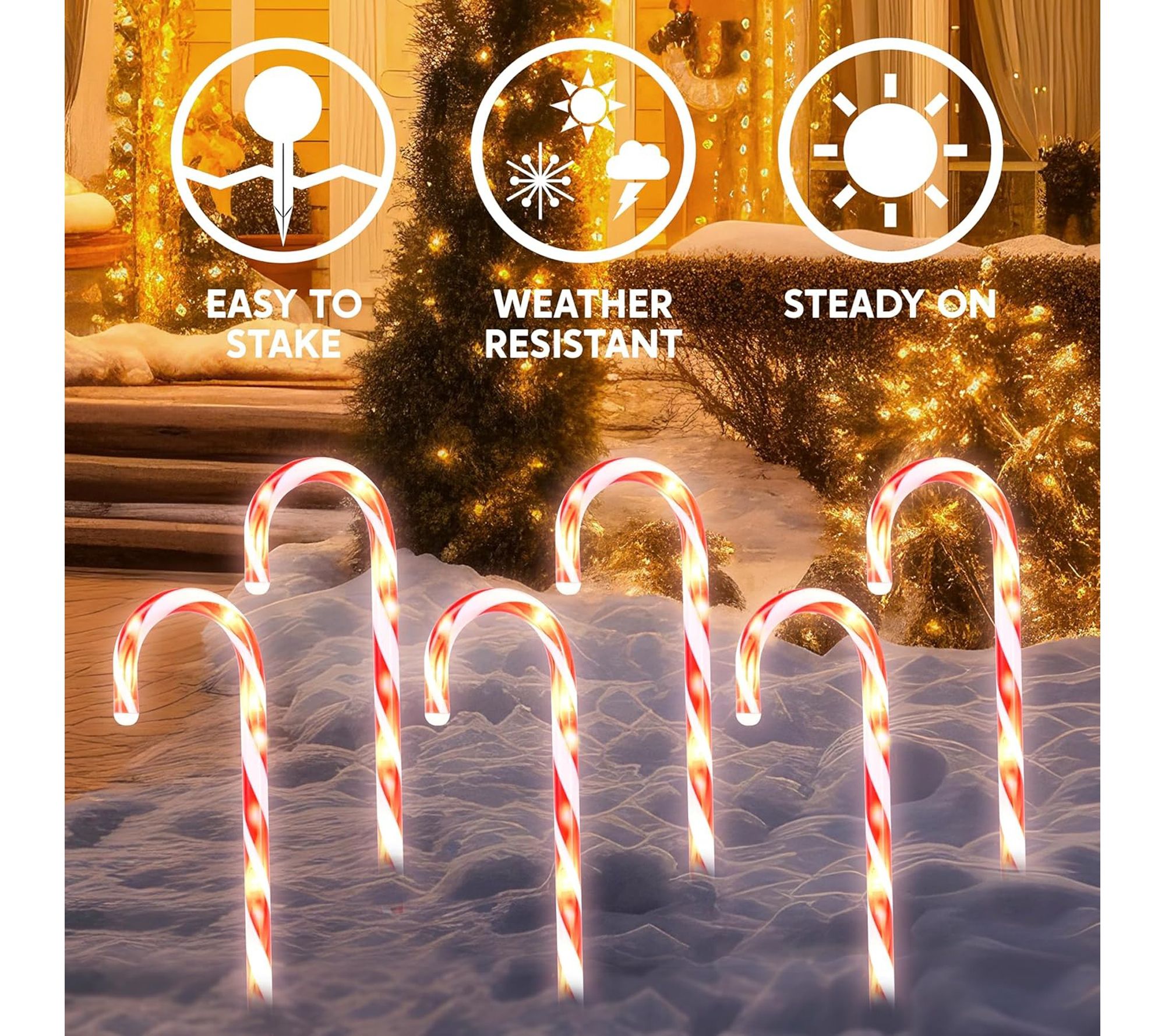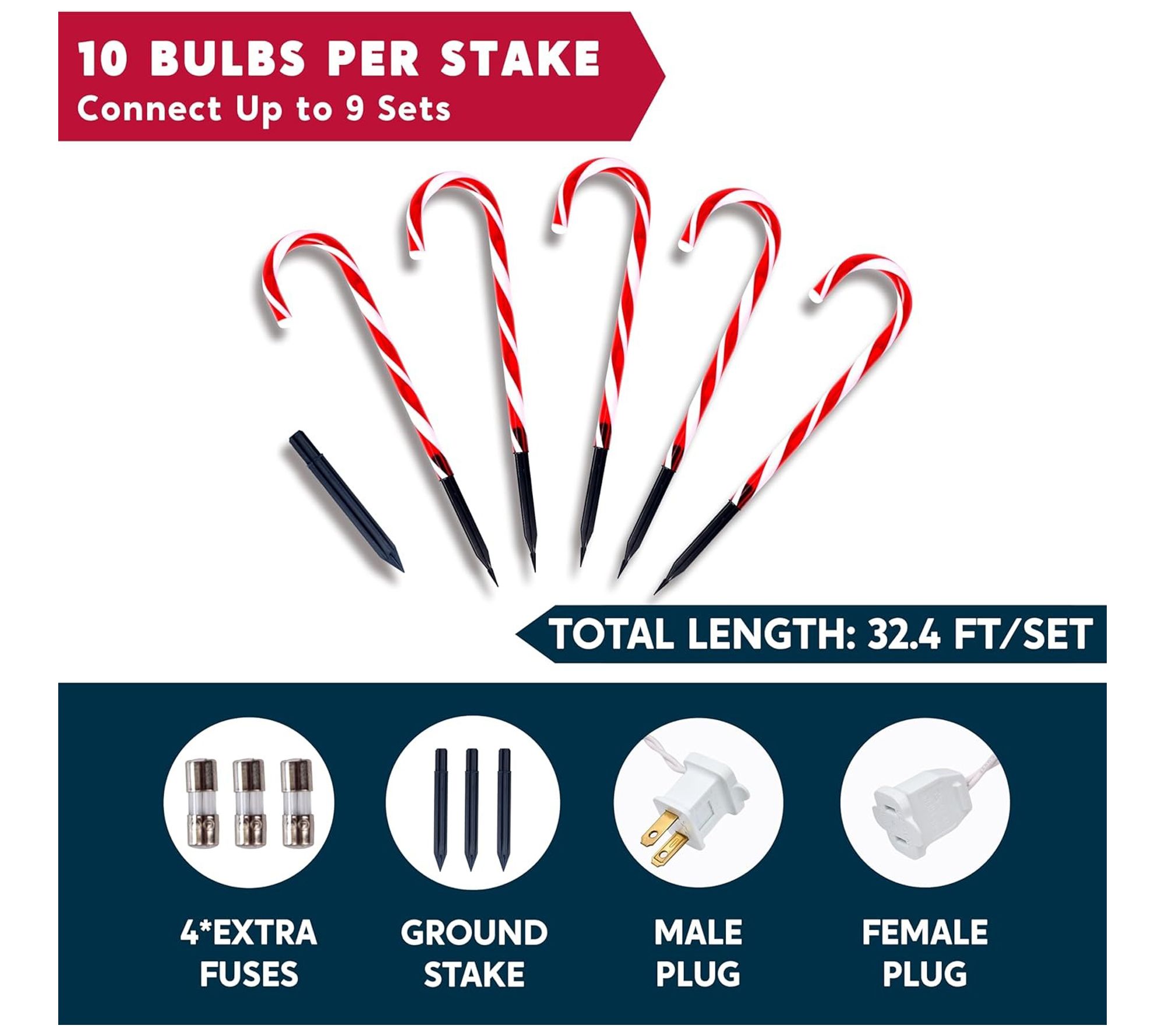 Brighten your holidays with these candy cane pathway marker lights, transforming your walkway into a festive wonderland with warm white illumination and easy-to-install stakes. The long power cable lets you arrange these pre-lit decorations just the way you want, perfect for welcoming guests with seasonal cheer both indoors and outdoors. From Joyfy.