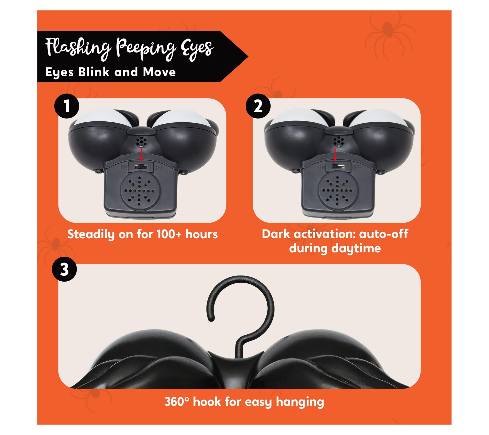 Transform your haunted house or front yard into a true fright fest with these spooky peeping eyes lights. The animated peepers glow, flash, and move in orange, green, and purple, activating in the dark for maximum creepiness that will intrigue trick-or-treaters and delight guests. Place them in your window, bushes, or trees for a playful, ghoulish touch. From Joyfy.