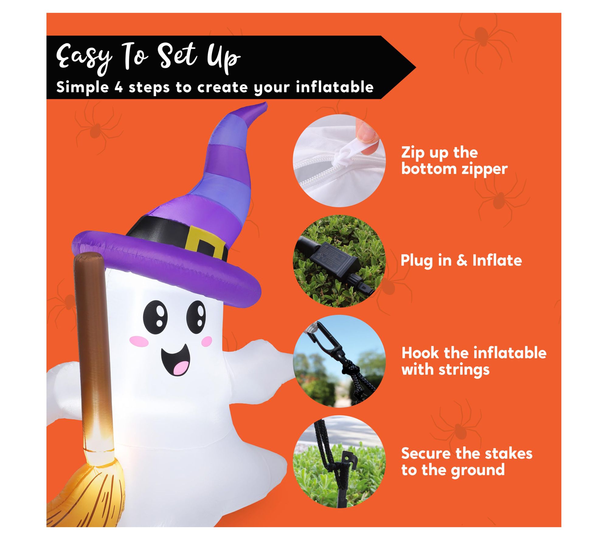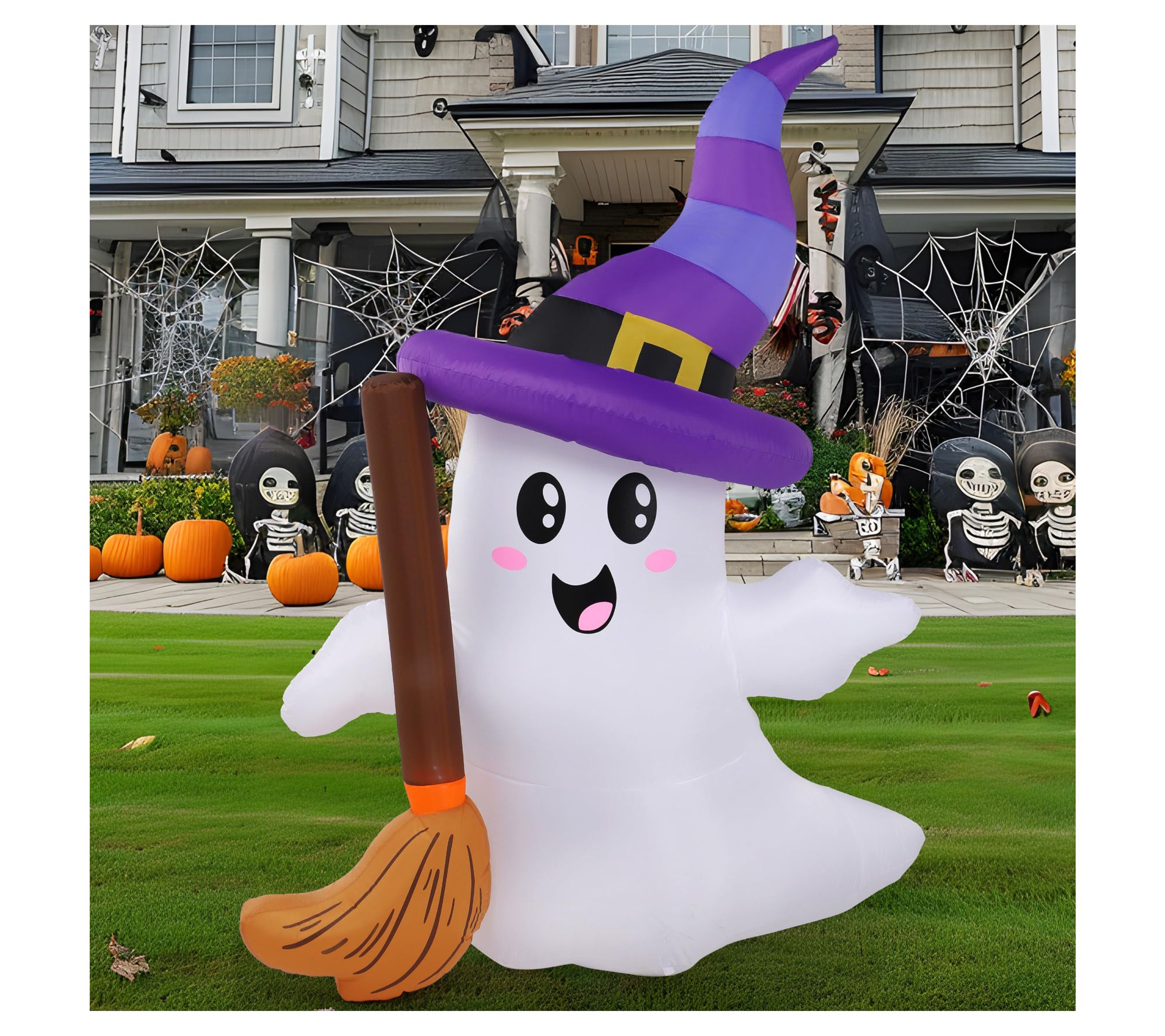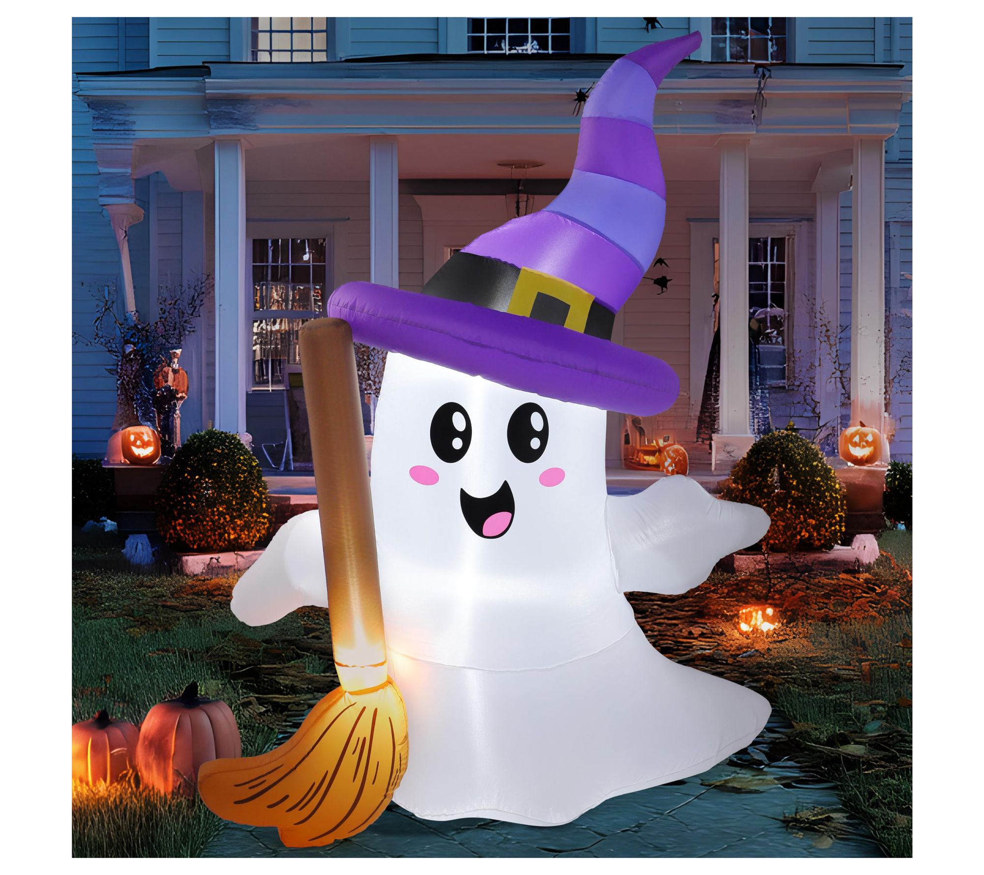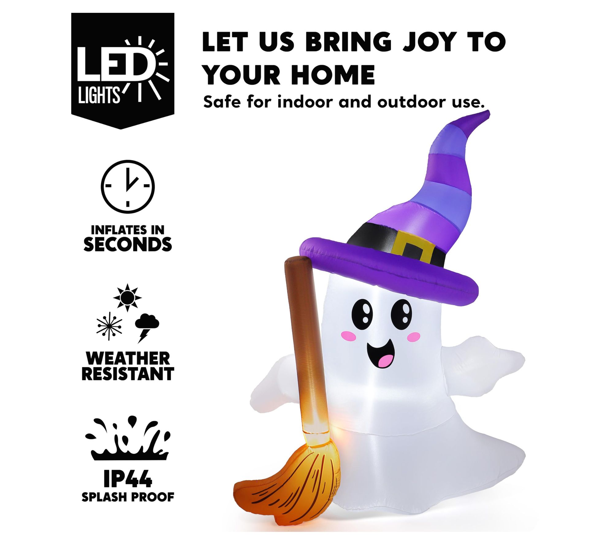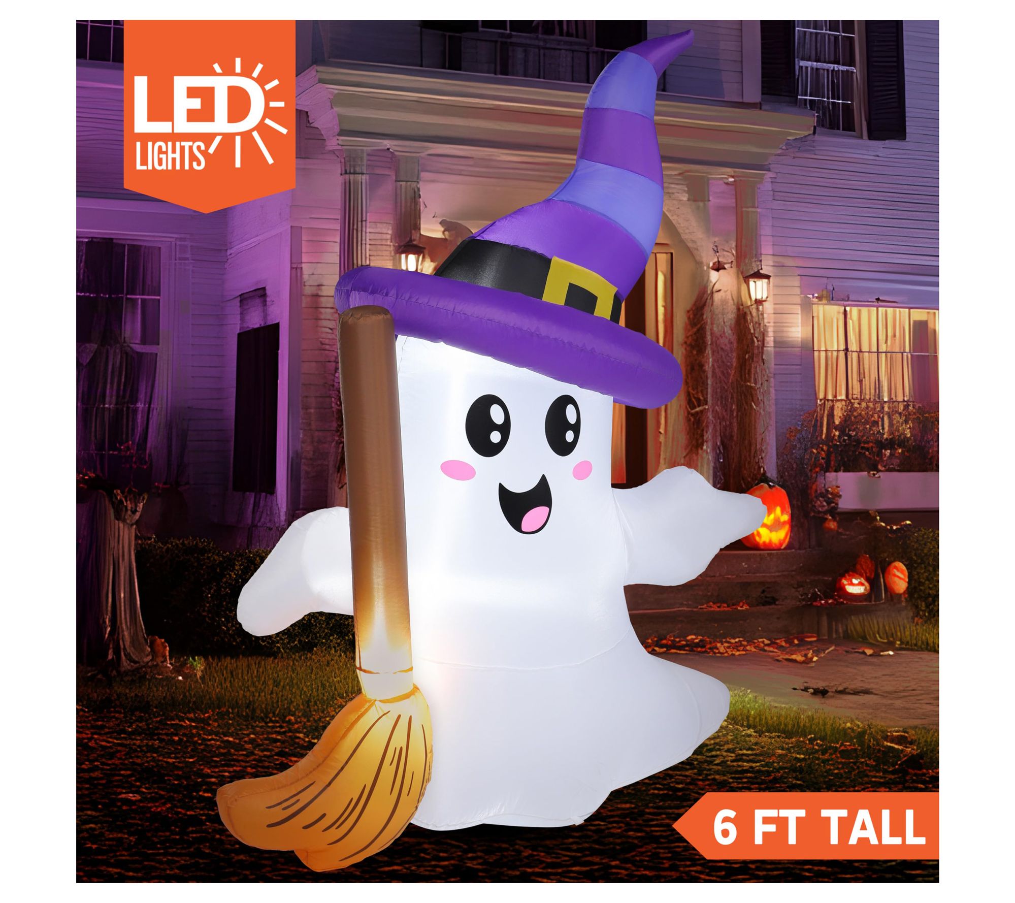 Each evening, watch as this six-foot-tall inflatable ghost brings playful Halloween spirit to your yard, glowing softly with built-in LED lights. Its friendly smile and tiny broom add whimsy, making it a delightful addition for gatherings at home, schools, or parties. Quick to set up -- just plug it in and enjoy. From Joyfy.