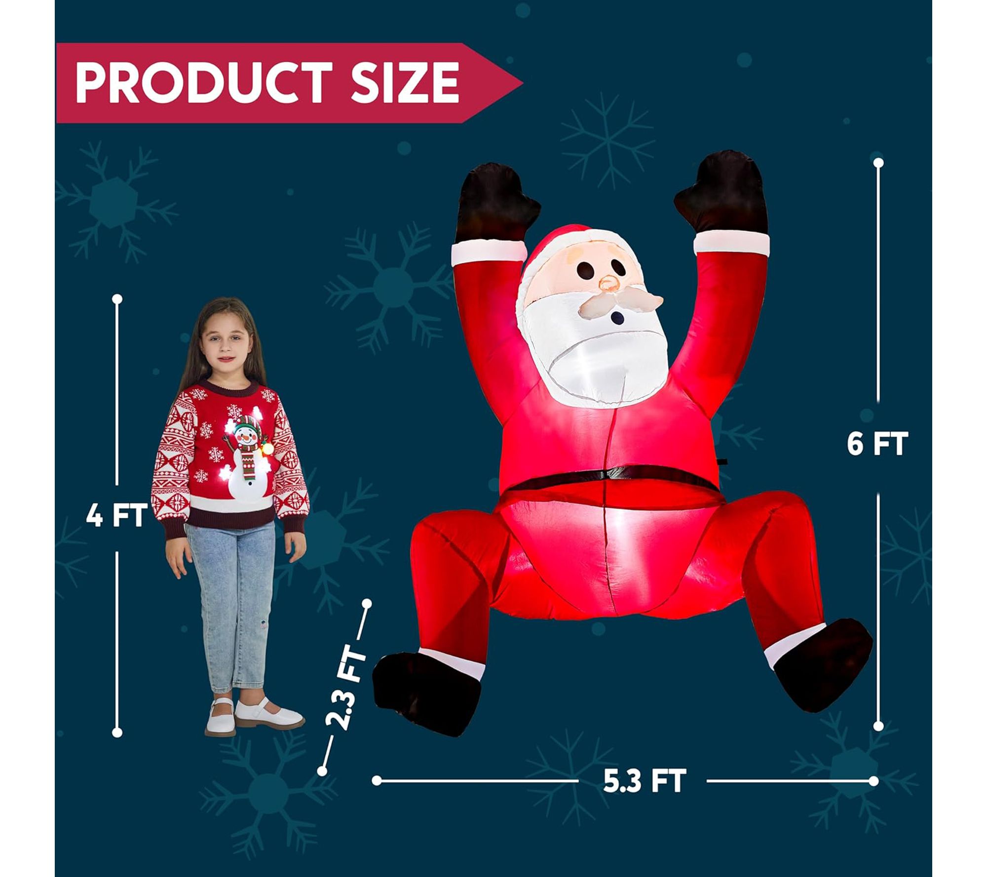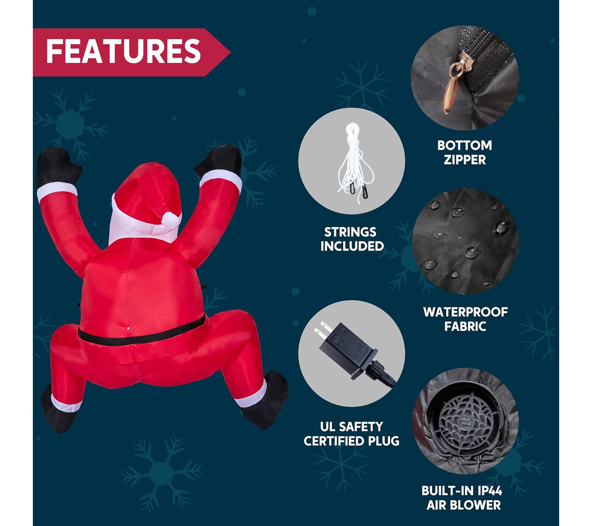 • Includes inflatable climbing Santa with extended cord, fastened ropes, built-in sandbags