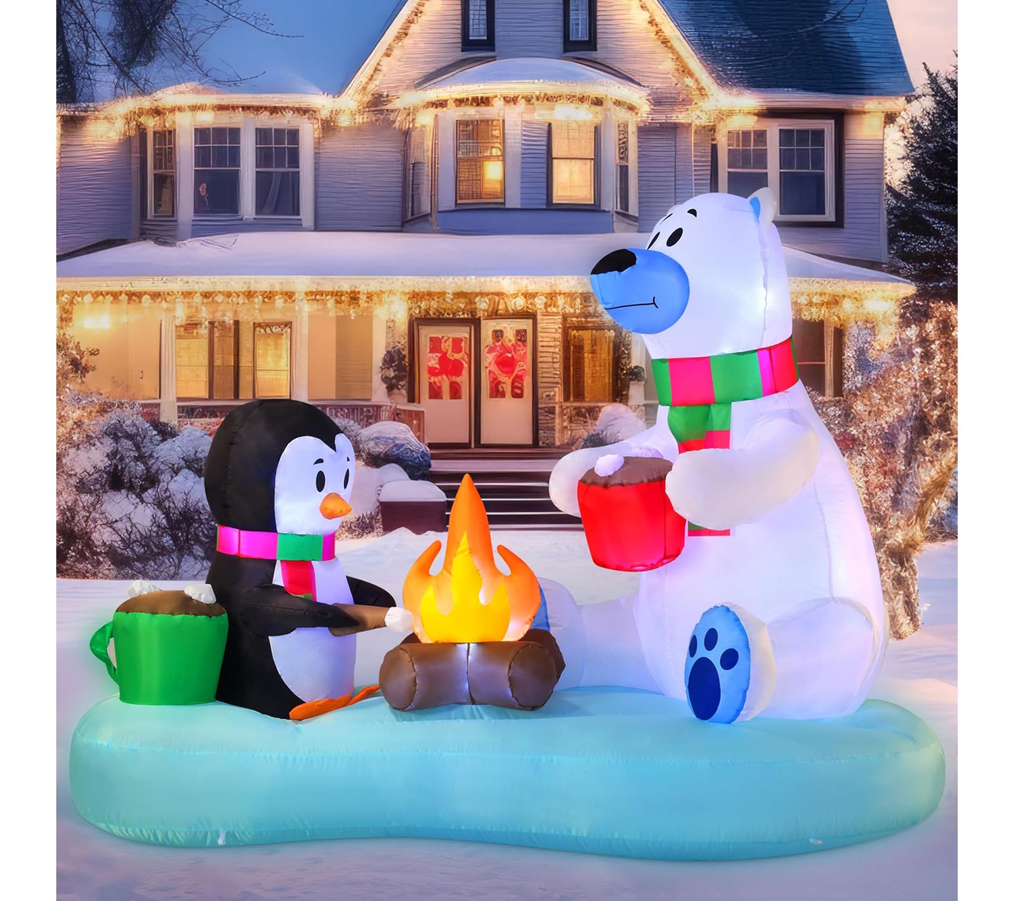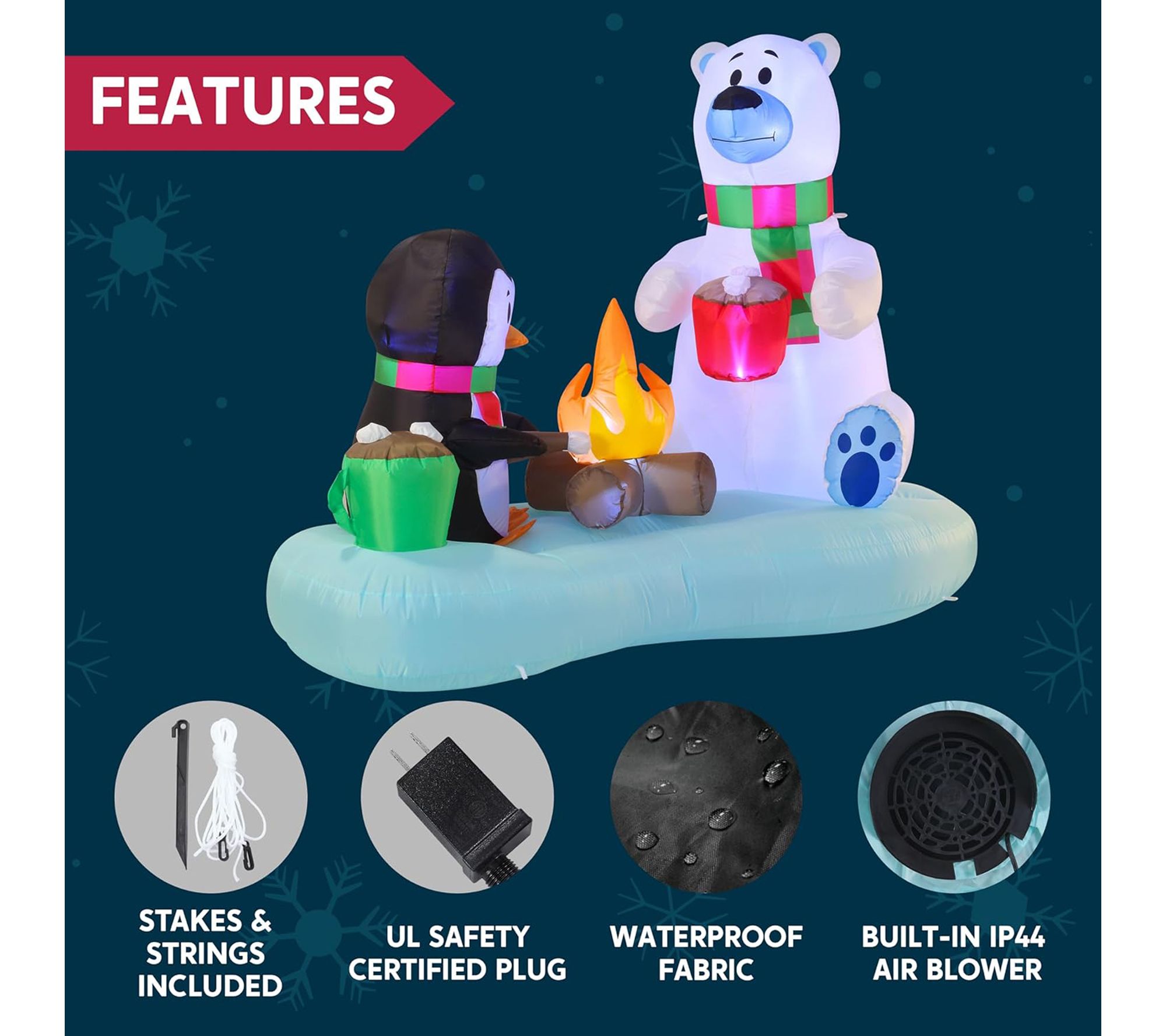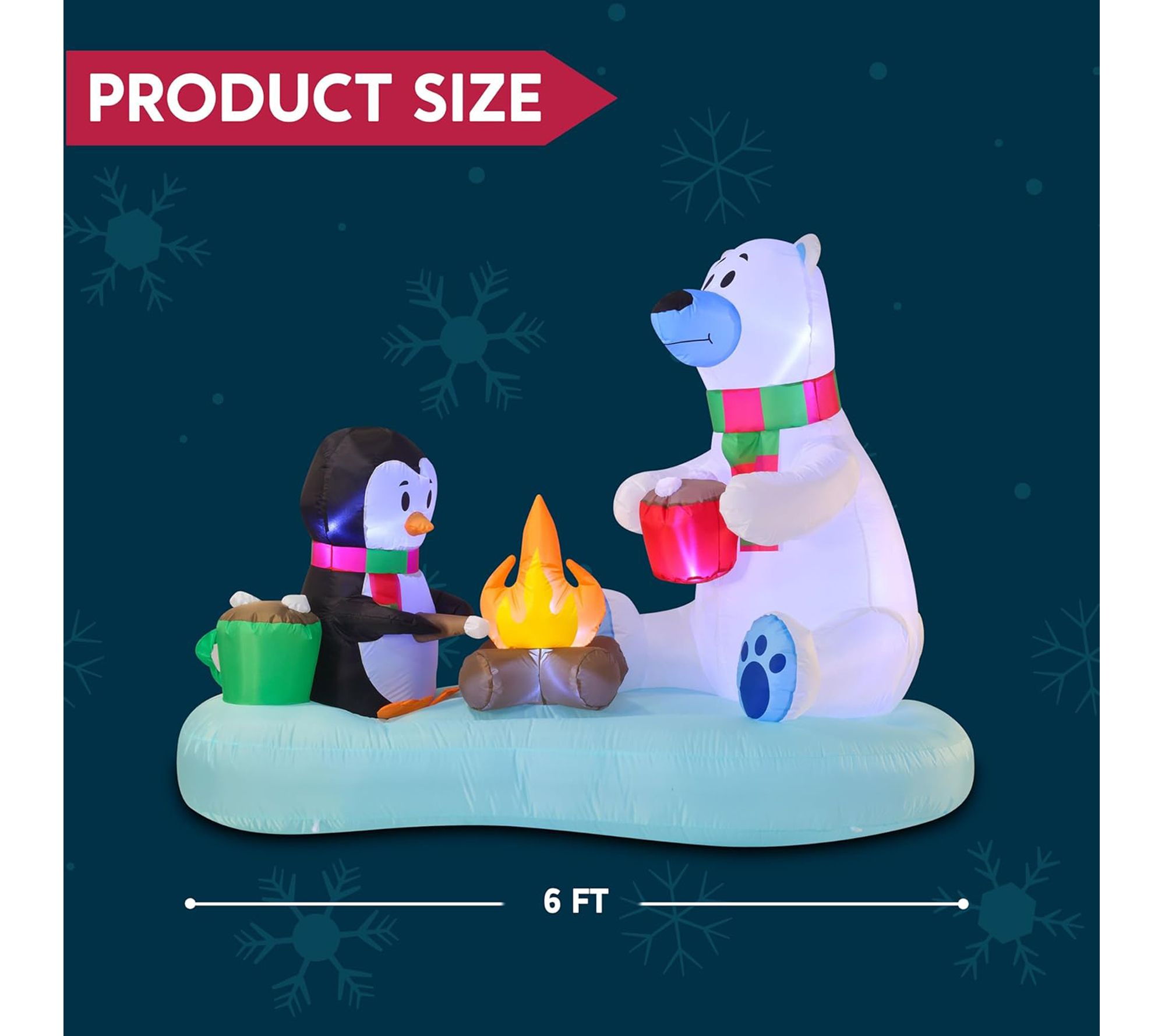 Transform your yard into a winter wonderland with this festive inflatable decoration, featuring a cheerful penguin and polar bear illuminated by bright white LED lights. Effortlessly set the scene for holiday gatherings, as this 6'L display is easy to set up and adds a playful touch to both indoor and outdoor spaces. From Joyfy.