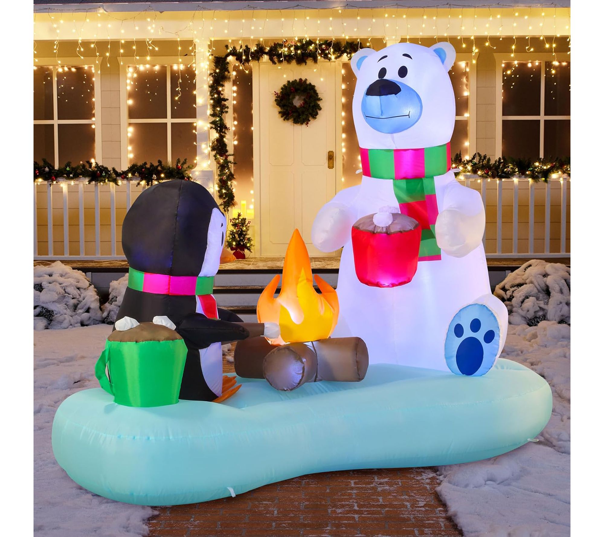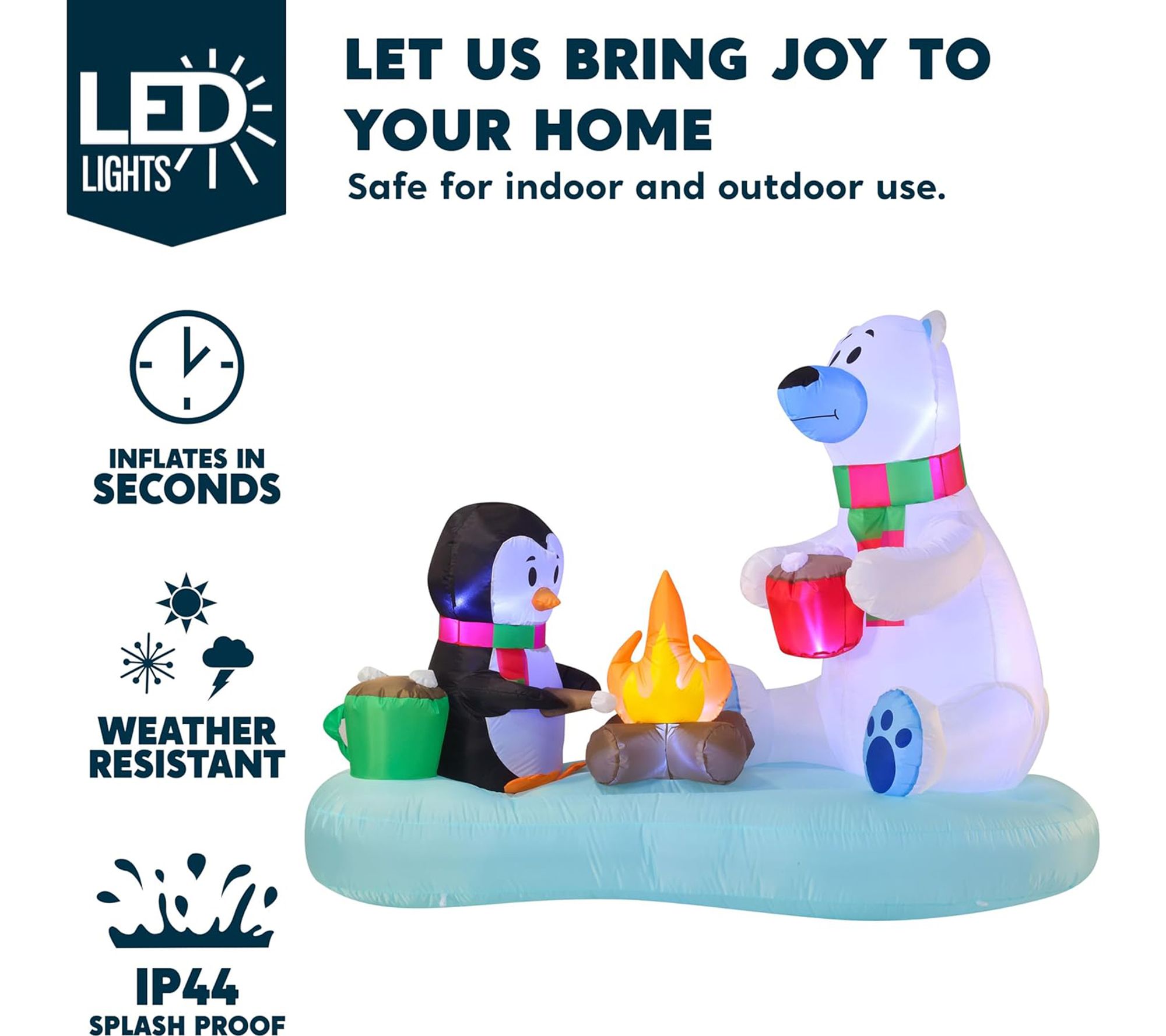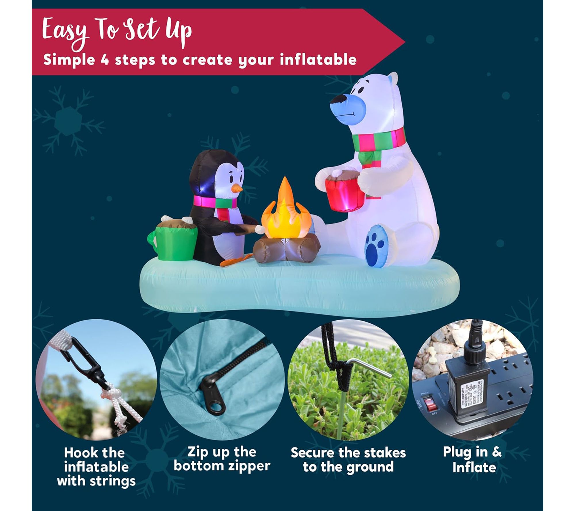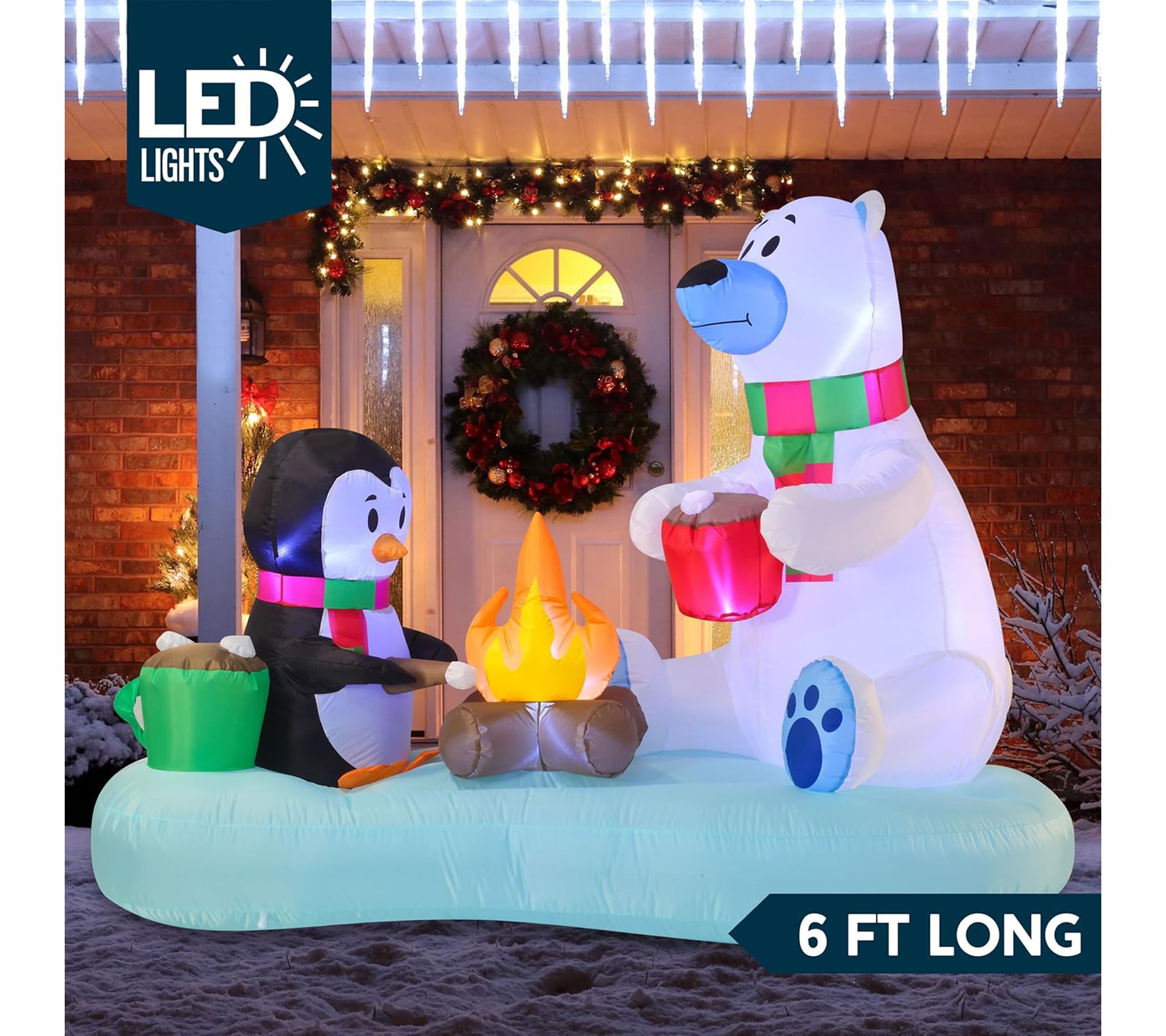 Transform your yard into a winter wonderland with this festive inflatable decoration, featuring a cheerful penguin and polar bear illuminated by bright white LED lights. Effortlessly set the scene for holiday gatherings, as this 6'L display is easy to set up and adds a playful touch to both indoor and outdoor spaces. From Joyfy.