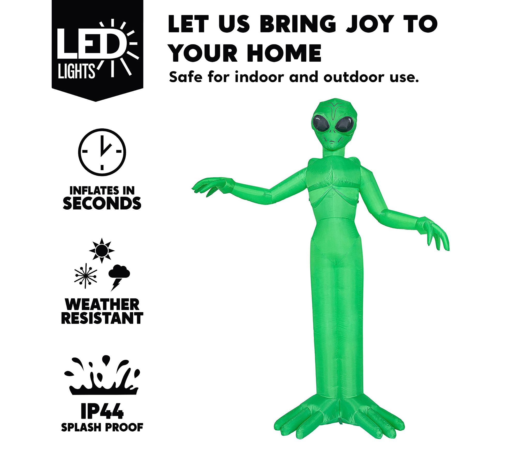 Haunt the neighborhood with a towering 9' inflatable alien that brings spine-tingling excitement to your Halloween display. Glowing with built-in white LED lights and designed to captivate both kids and adults, this striking centerpiece helps set the mood for trick-or-treaters and party guests. From Joyfy.