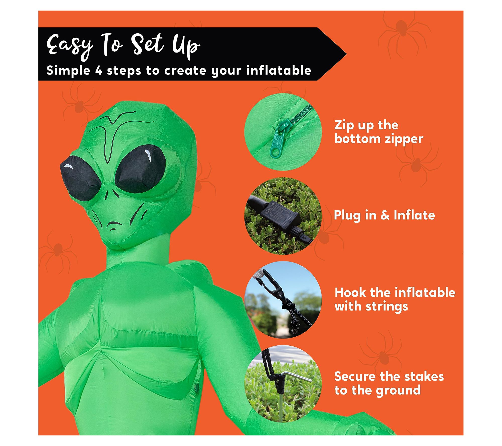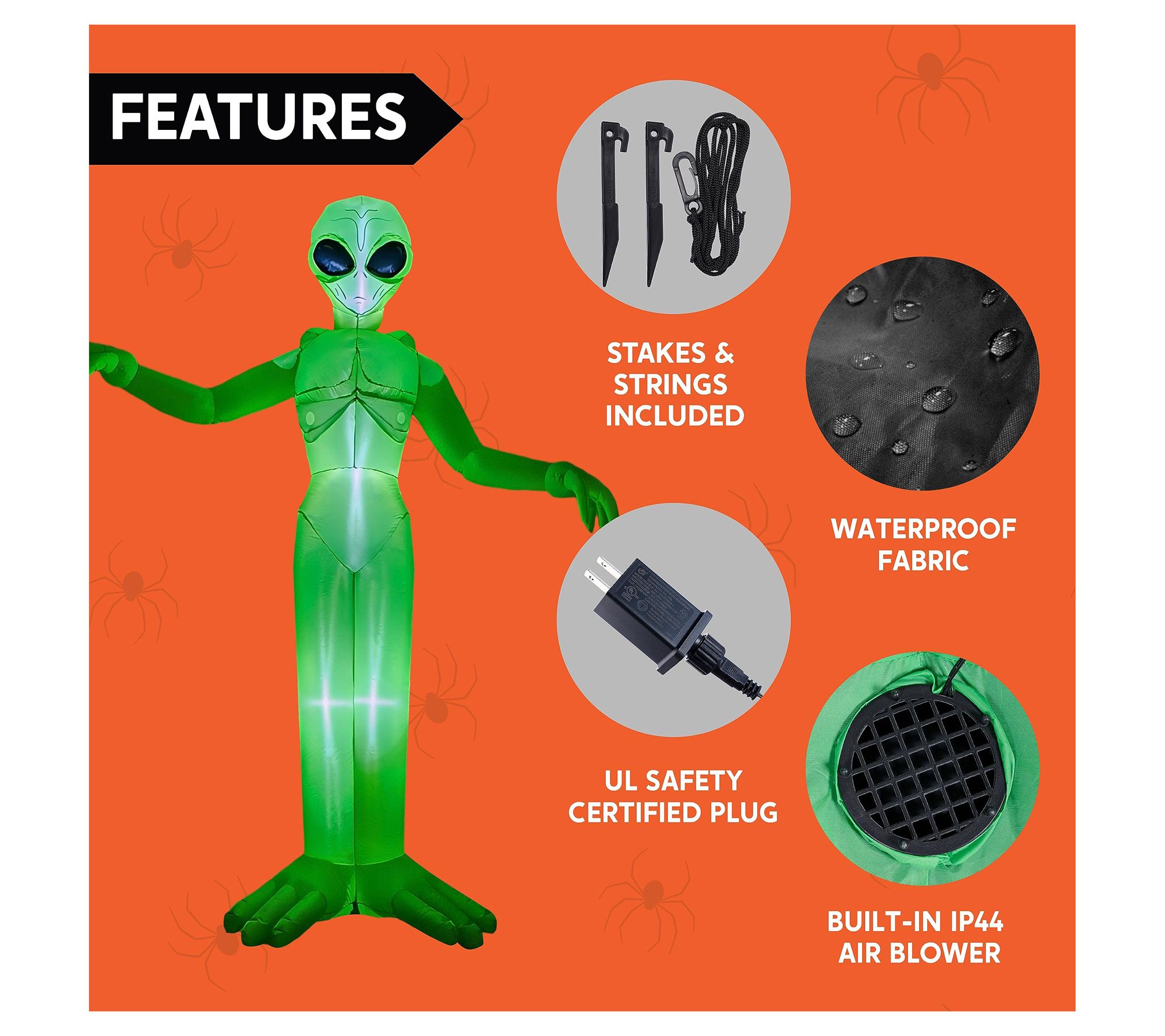 • Includes a 9' Halloween inflatable, an extended cord, ground stakes, fastened ropes