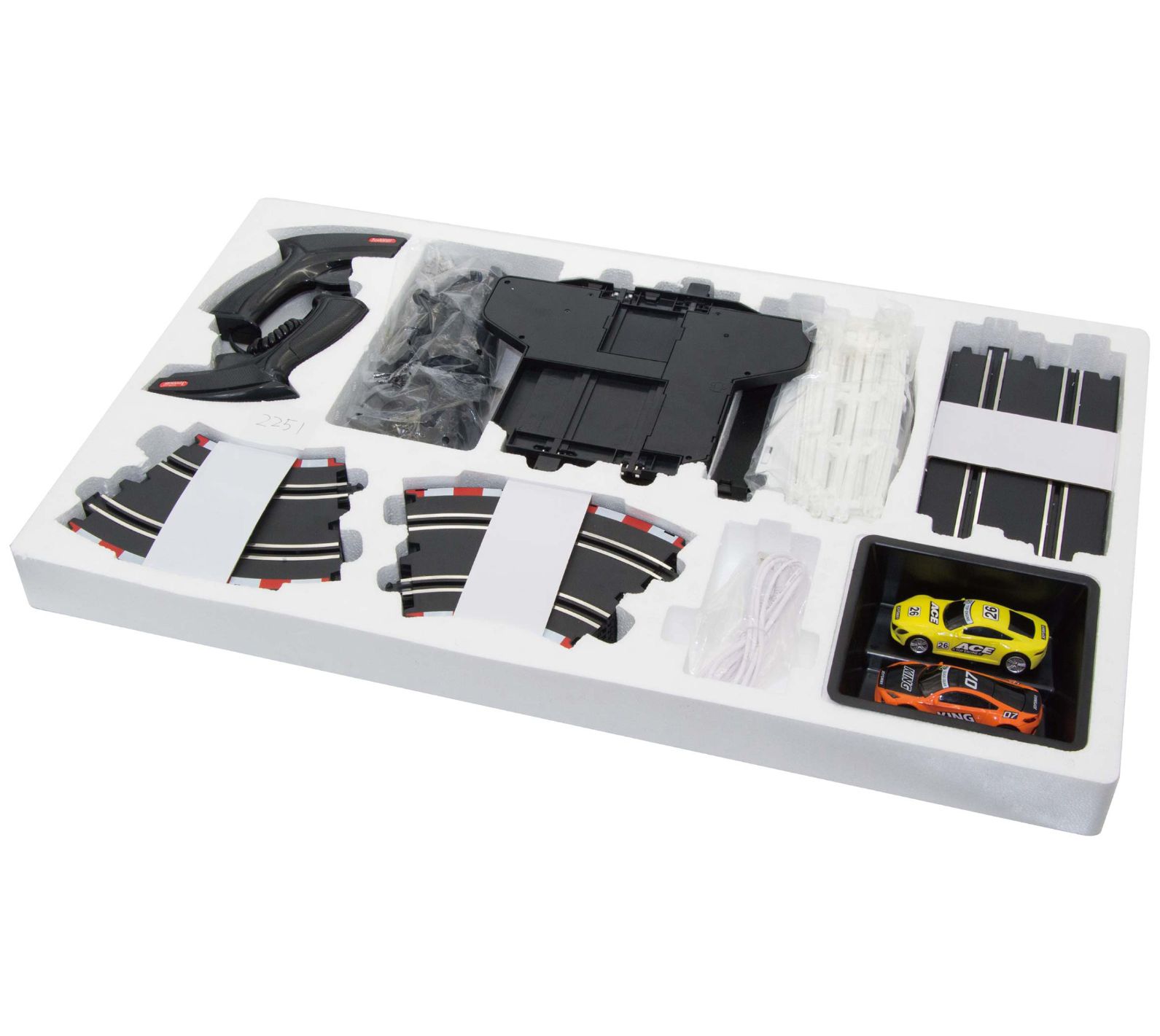 • 40 piece set includes Yellow sport car, Orange sport car, 2 speed controller, Mechanical Lap counter & Powerbase combo track, USB power cable, 22 Track pcs, 2 Bridge barriers, and 12 Guardrails