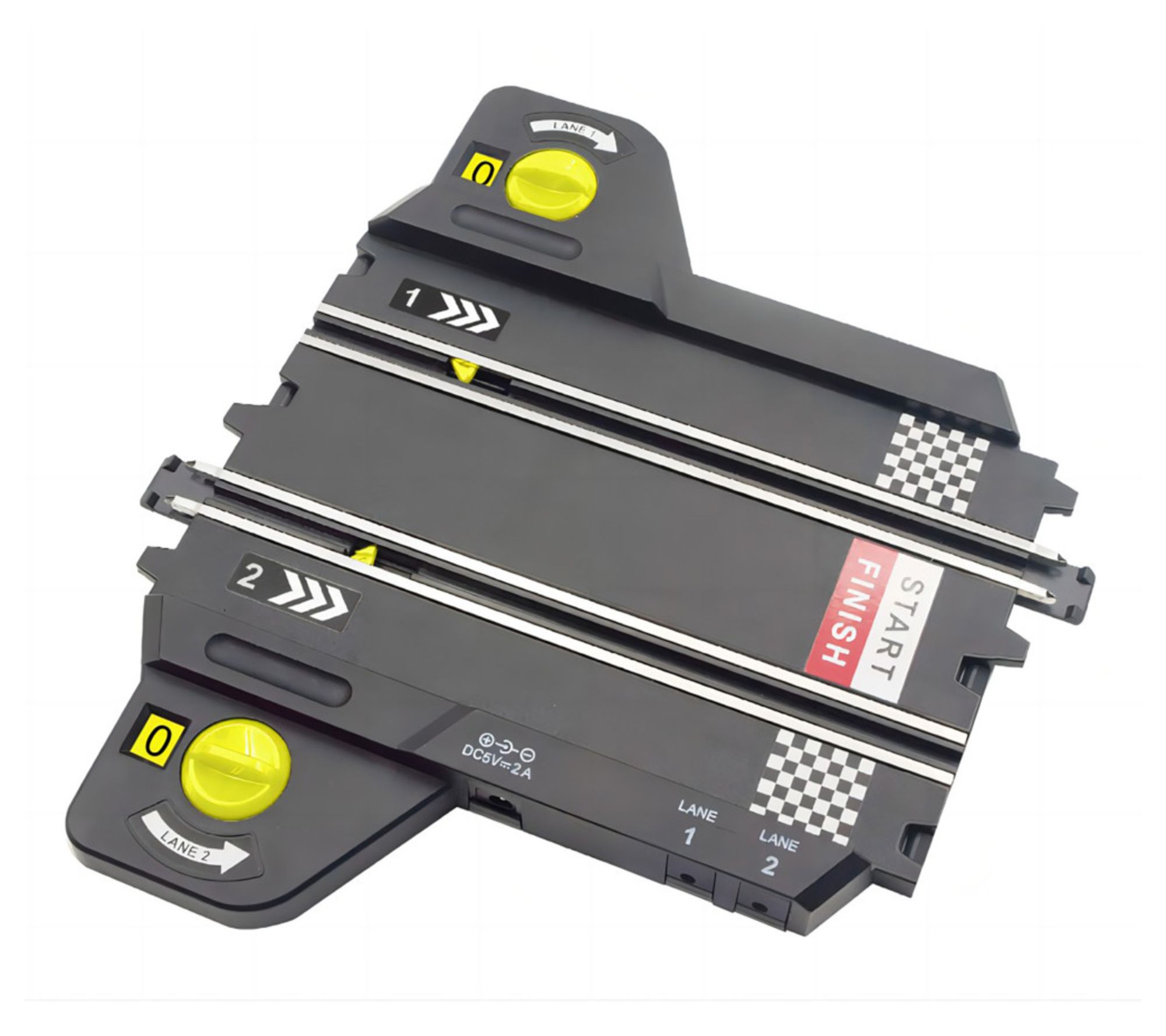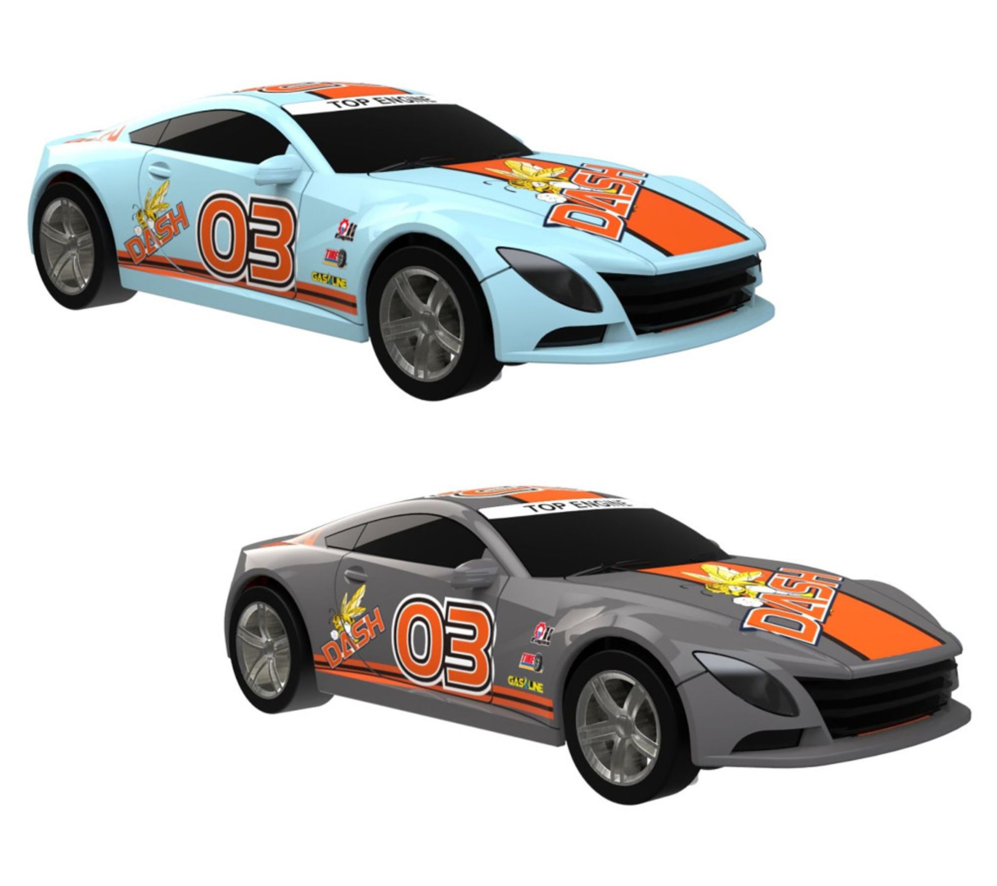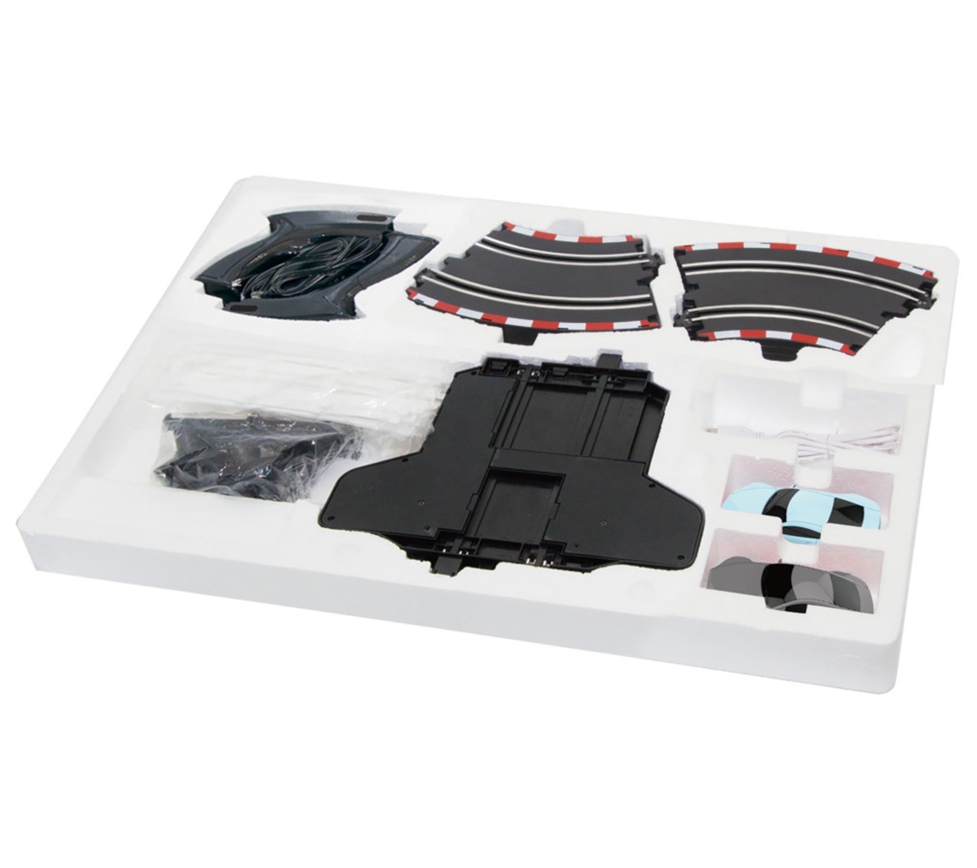 • Includes Dash blue car, Dash gray car, two pistol grip speed controllers, mechanical lap counter and powerbase combo track, USB power cable, 12 curve tracks, three straight tracks, two bridge barriers, two bridge supports, two curve track supports, and 12 guardrails