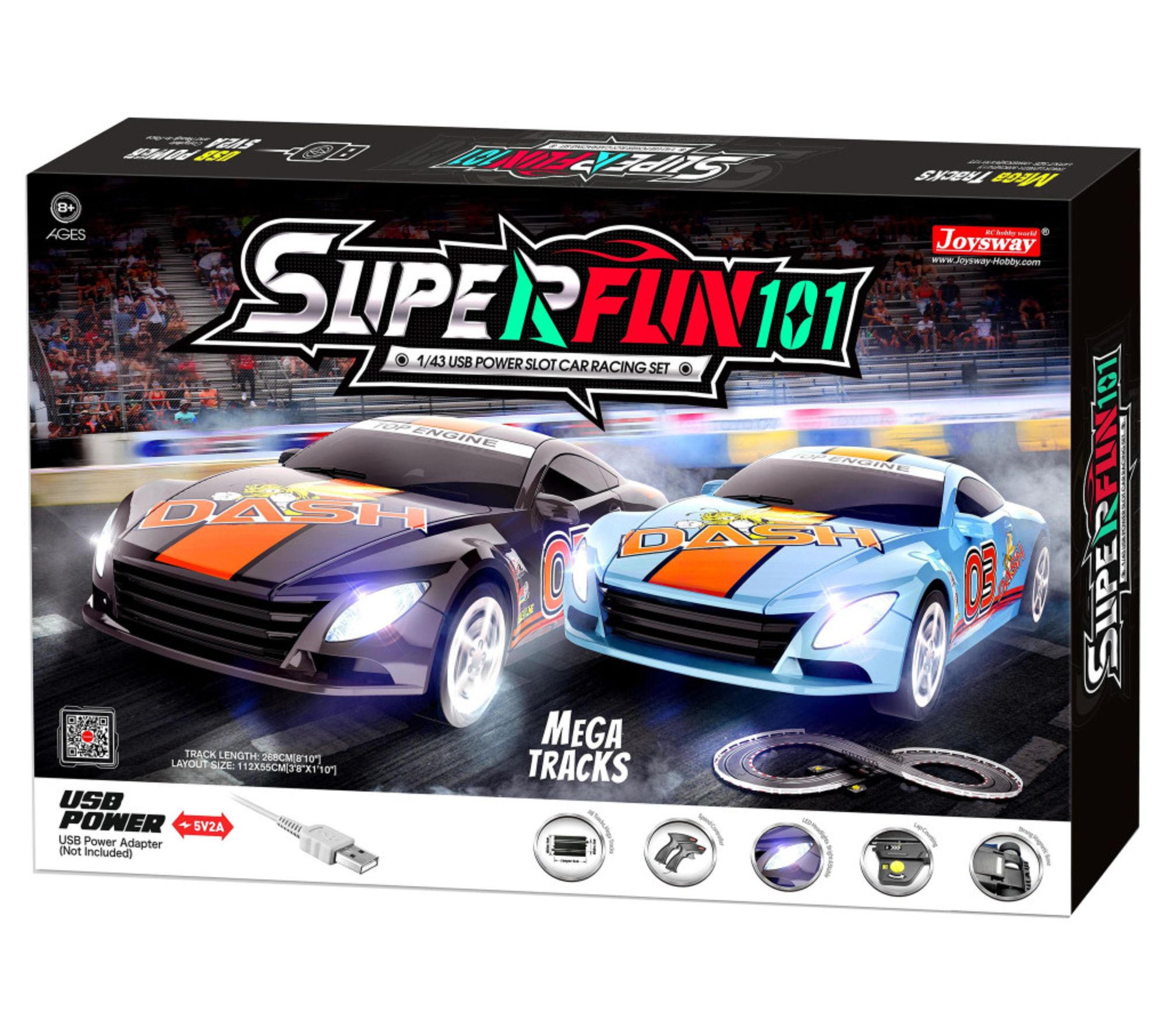 Race your friends with this complete slot car racing set featuring two cars with controllable speeds. From Joysway.