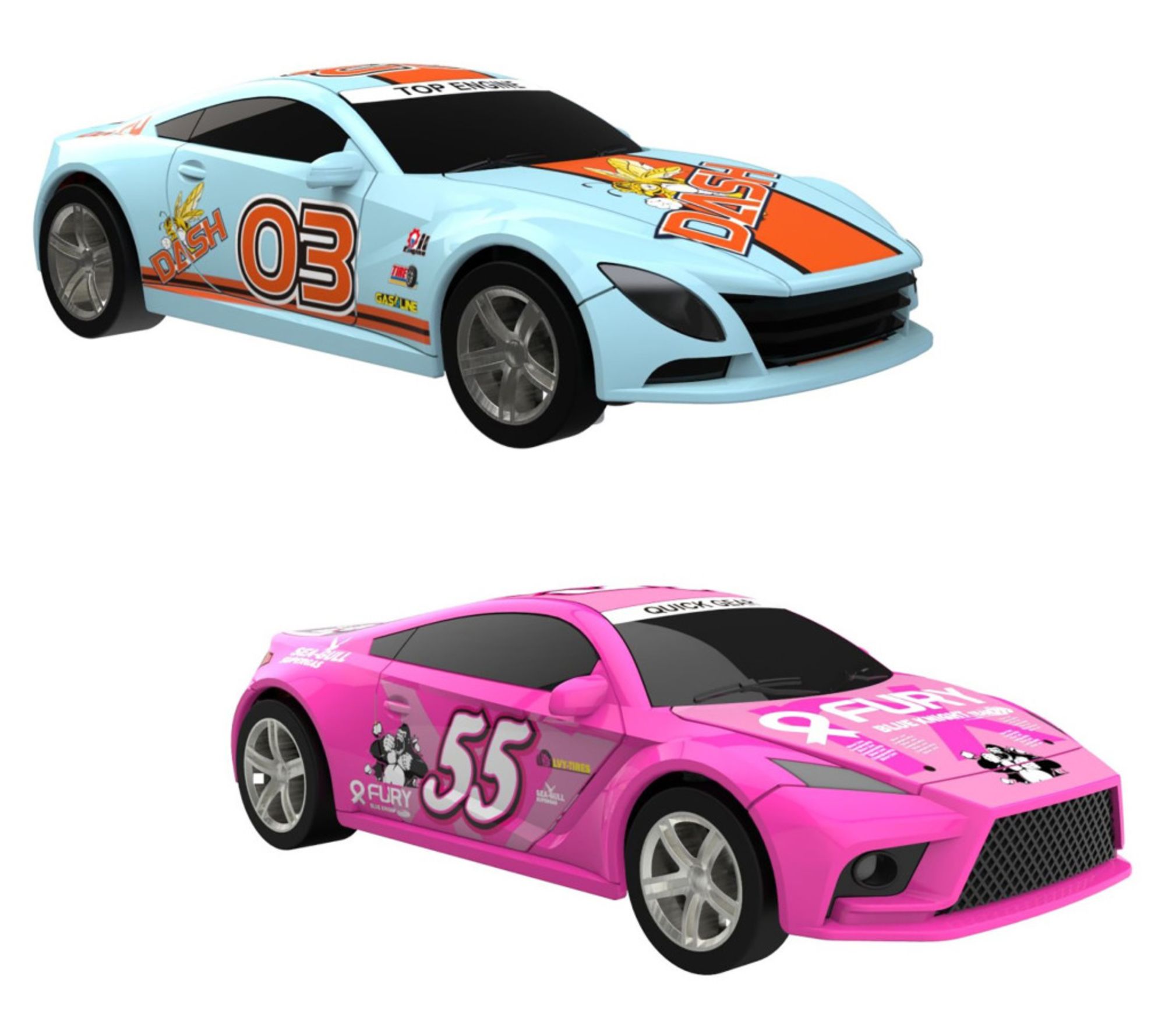 • Includes Dash blue car, Fury peach car, two pistol grip speed controllers, mechanical lap counter and powerbase combo track, USB power cable, 12 curve tracks, nine straight tracks, two banked track, seven bridge stands, six bridge pillars, seven bridge track supports, holding post for banked tracks, holding post connector, two bridge barriers, and 12 guardrails