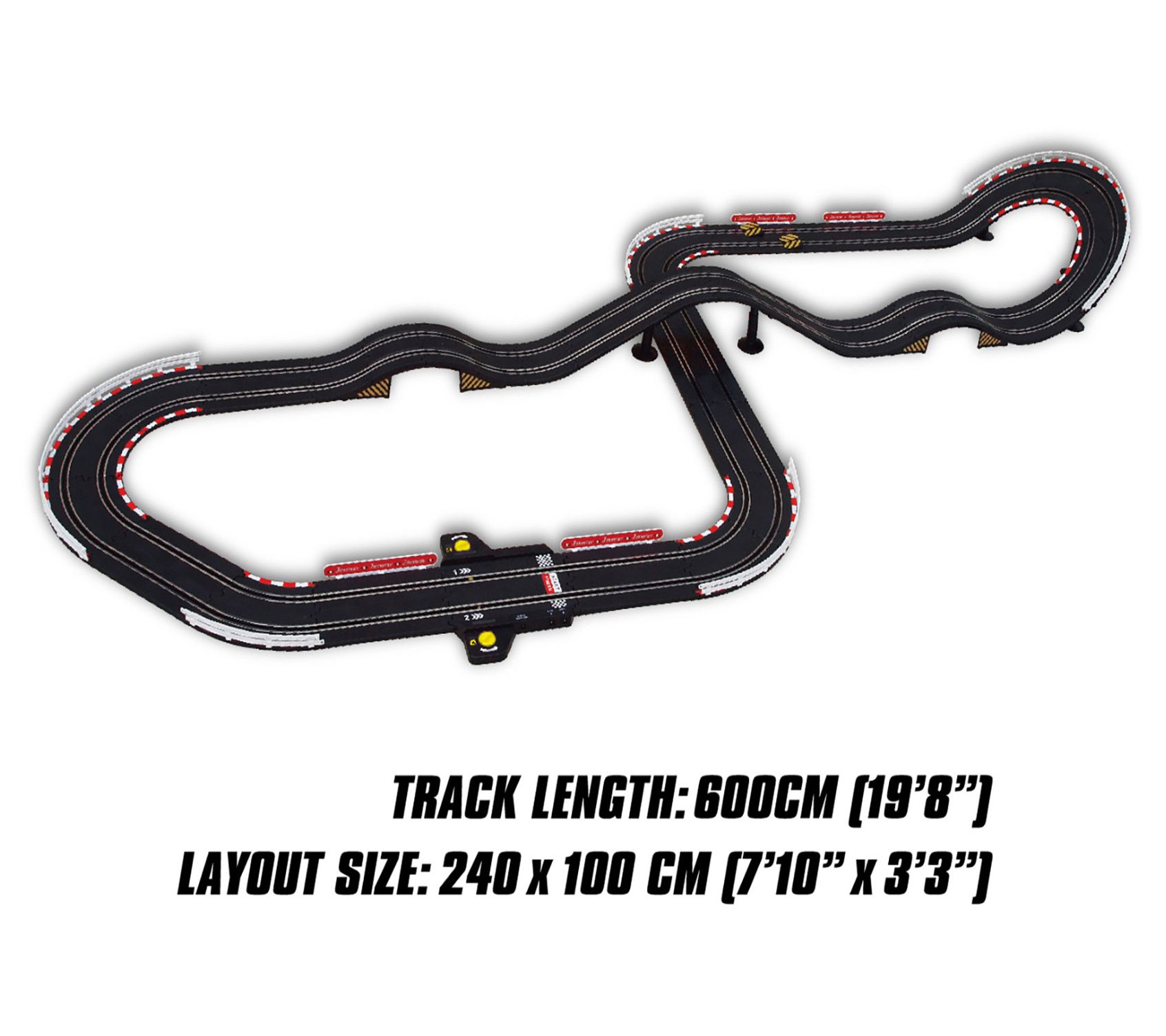 Race your friends with this complete slot car racing set featuring two cars with controllable speeds. From Joysway.