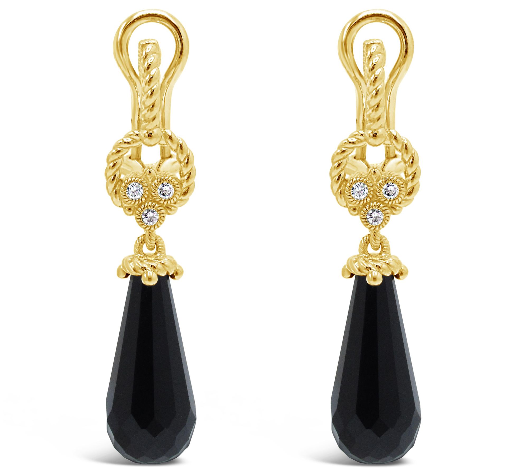 Add drama to your ensemble with these black onyx and diamond earrings. From Judith Ripka.