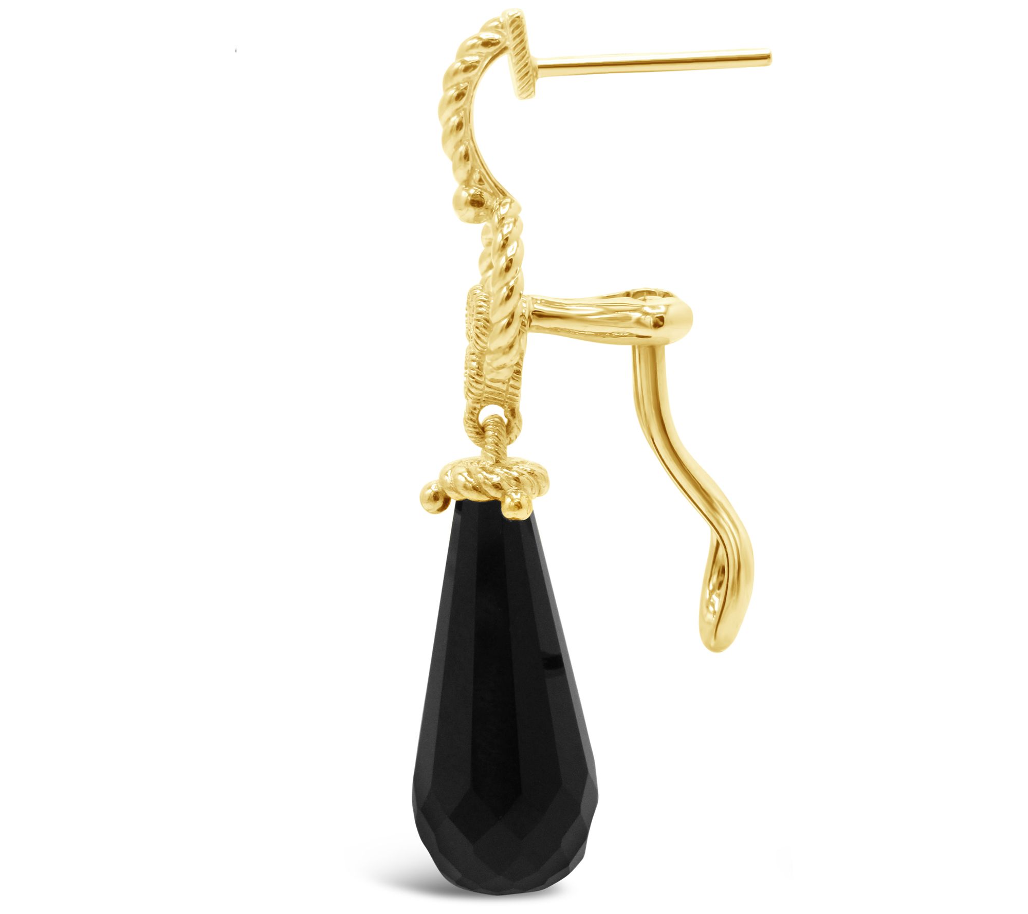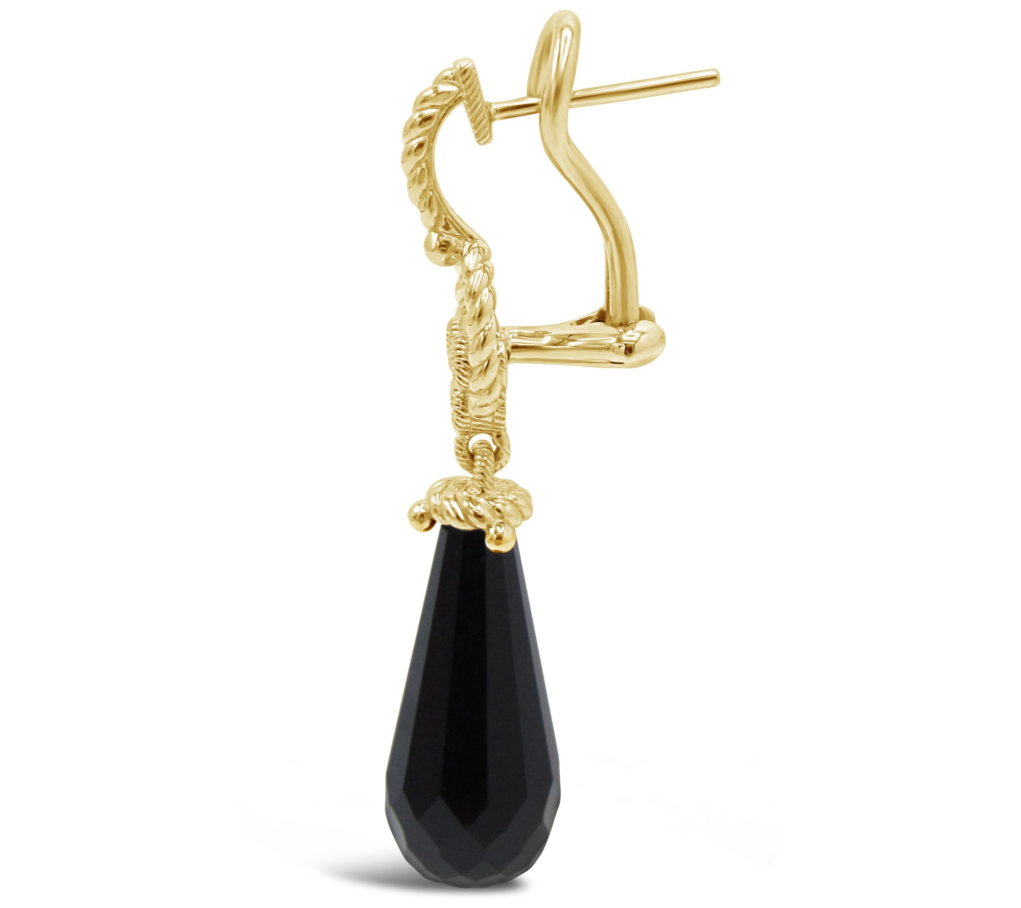 • Pineapple-cut black onyx drop from berge and rope motif design with three, round, bezel-set diamonds