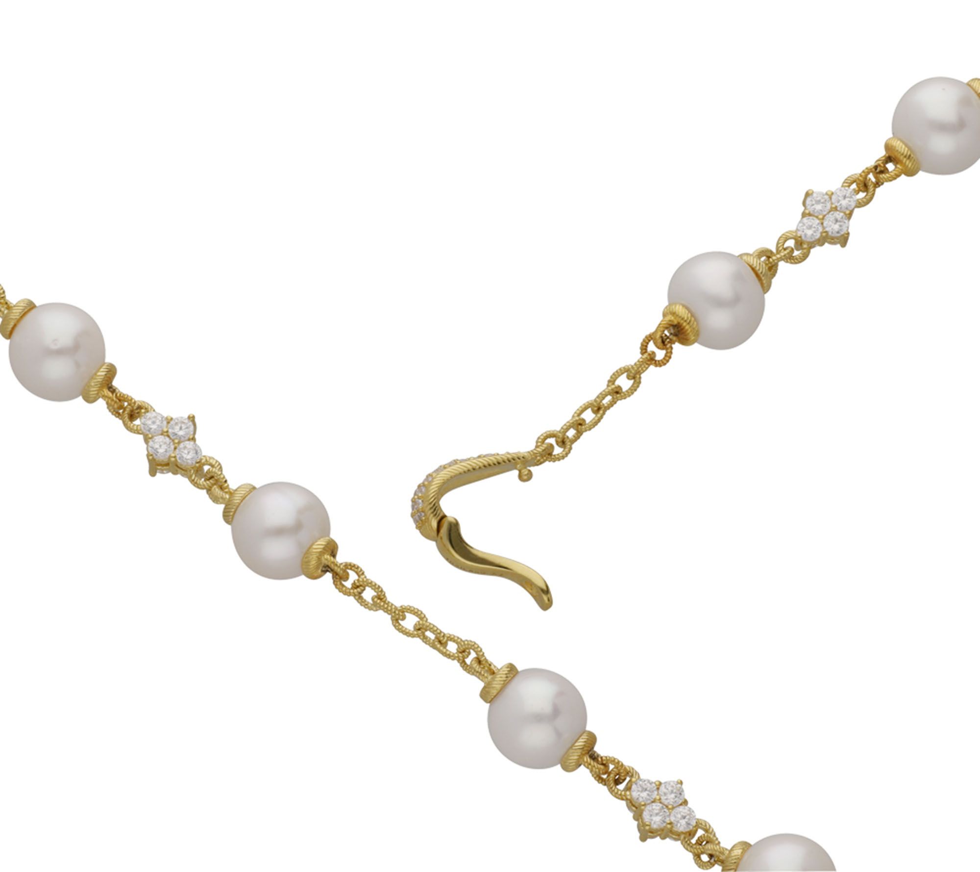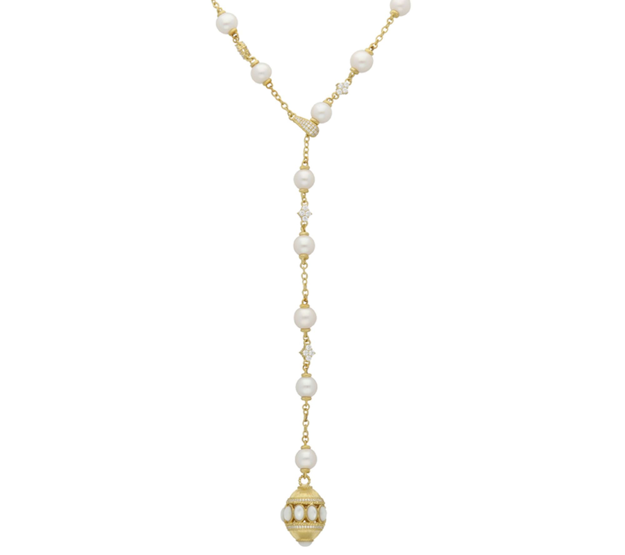 Ornately designed in 14K gold-clad sterling silver, this Y-shaped necklace features cultured freshwater pearl stations that alternate with cubic zirconia Diamonique(R) simulated diamonds and chain links. From Judith Ripka.