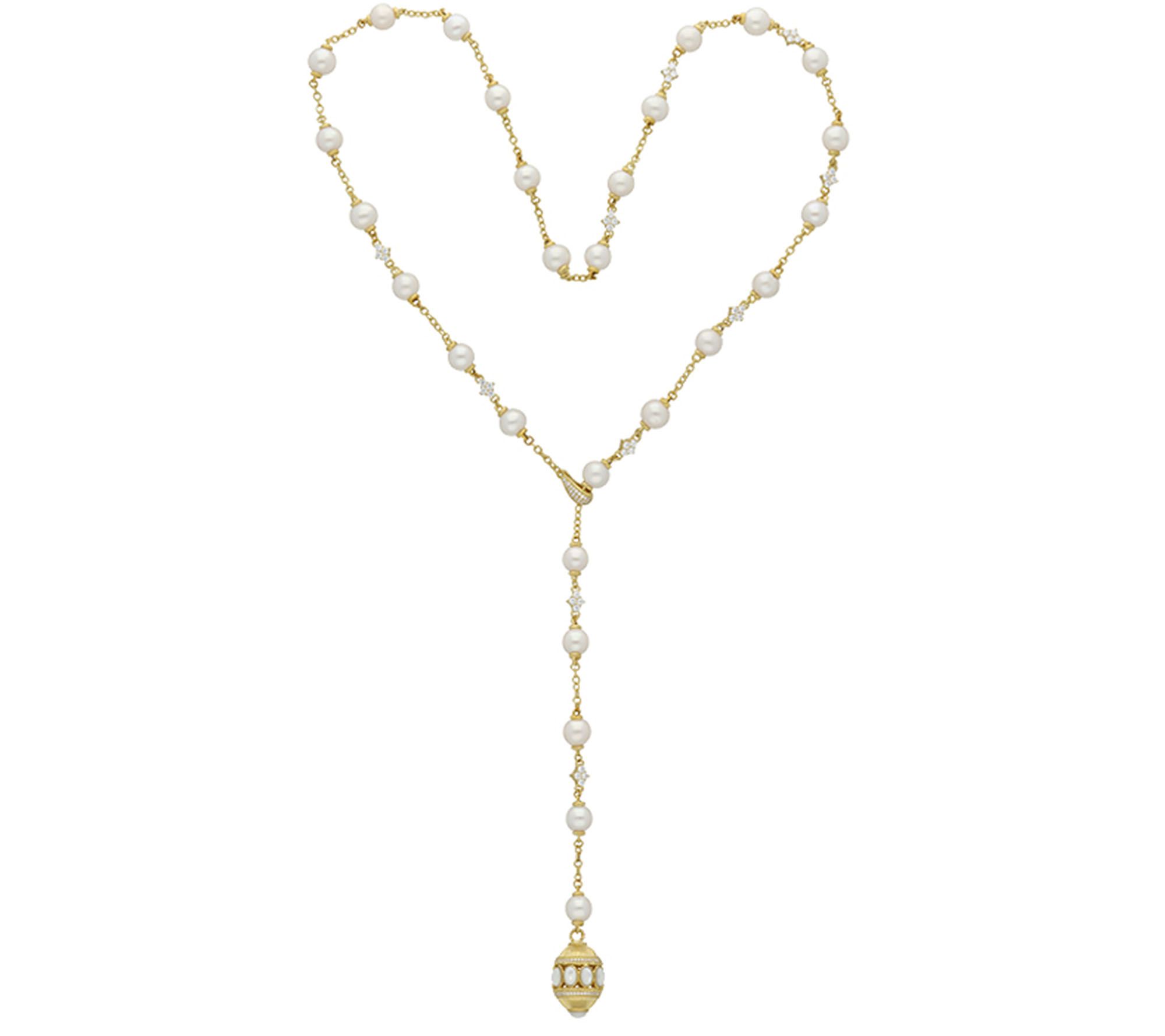 White cultured freshwater pearl stations alternating with four prong-set Diamonique simulated diamonds connected by chain links with twisted rope and berge motifs throughout; Y-shaped design with oval-shaped charm on end; charm has oval-shaped mother-of-pearl cabochons across center; round, pave-set Diamonique simulated diamonds along top and bottom with twisted rope and berge textures