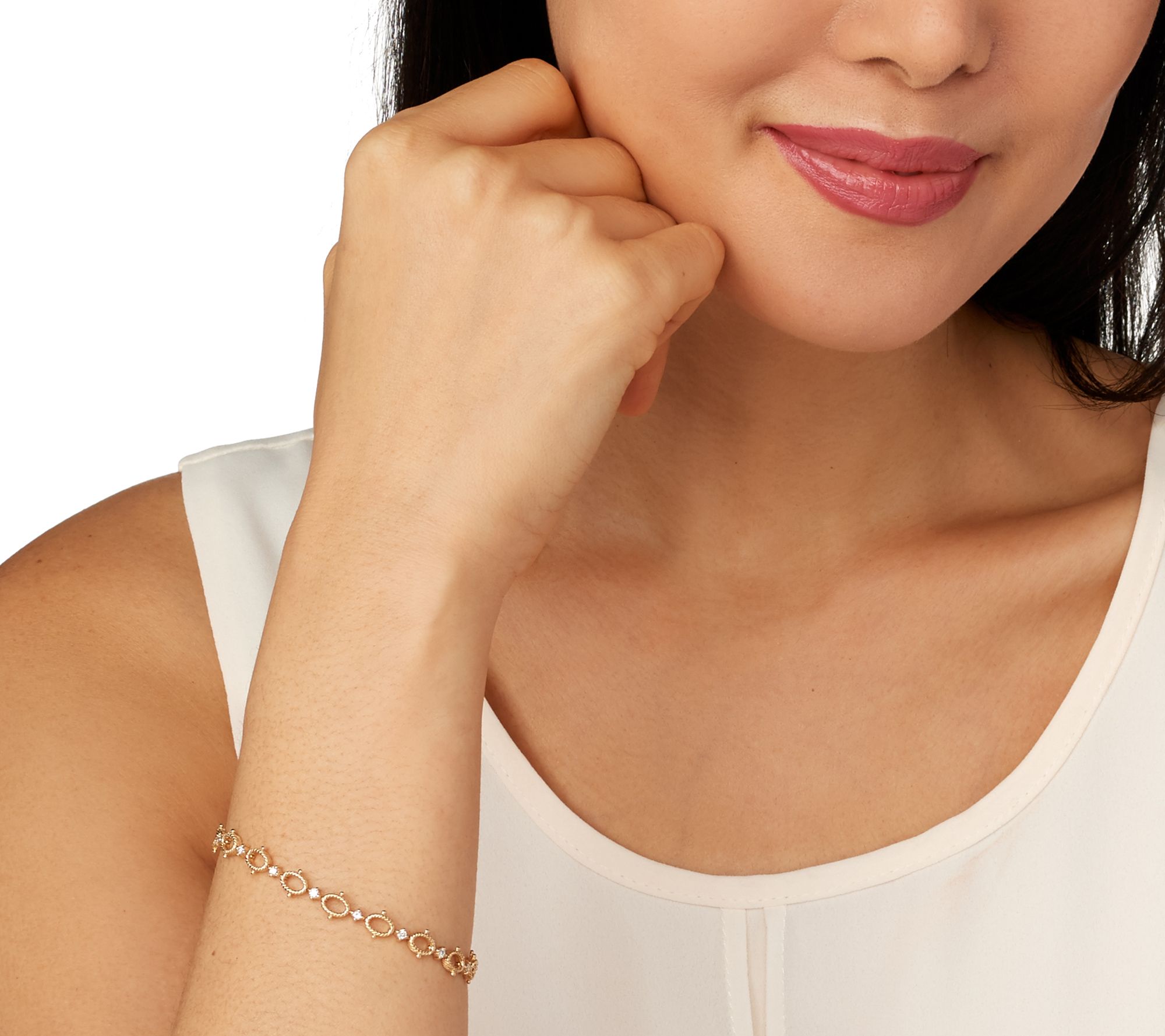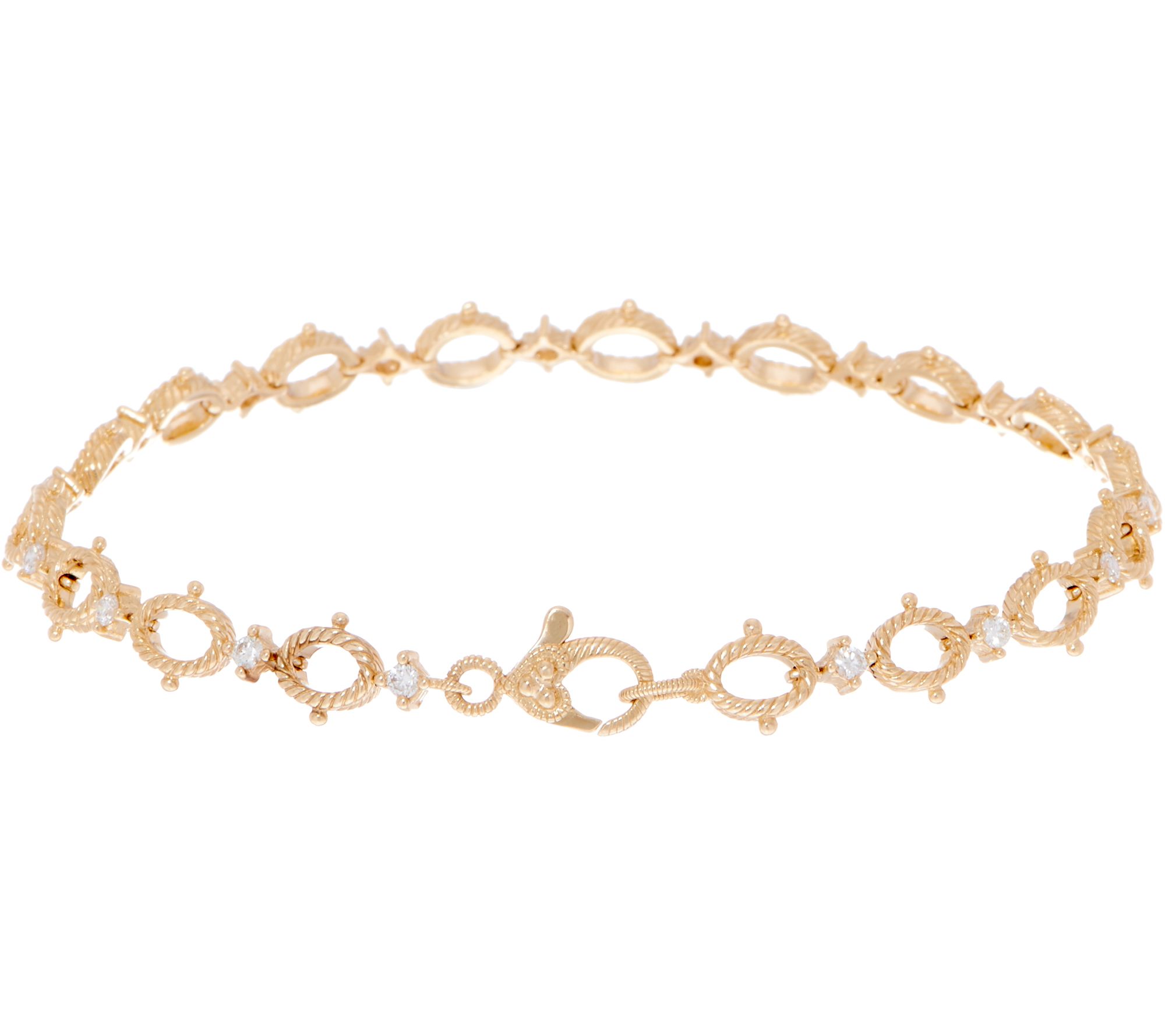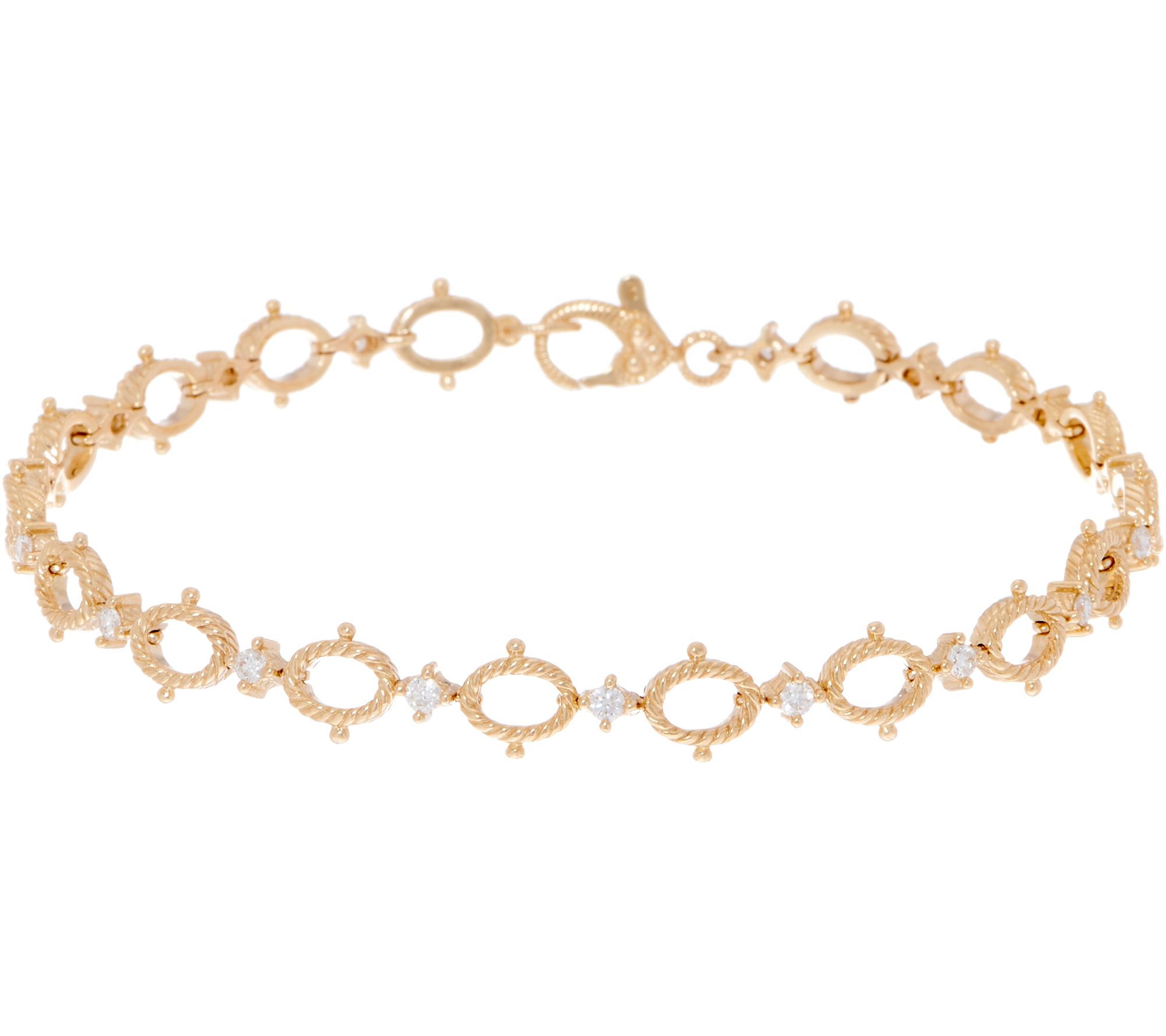 All dressed up and ready to dazzle, this 14K yellow gold bracelet has openwork oval links that alternate with prong-set, round white diamonds. From Judith Ripka.