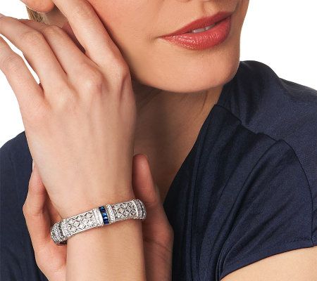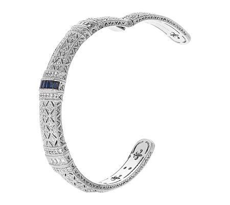 It's a signature look. The distinctive heirloom style of the Pia cuff showcases Judith's dramatic flair with baguette Diamonique(R) simulated diamonds sparkling in a time-honored, estate-style design. At the center, the cool gleam of blue sapphire gemstones is framed by rope texture for striking contrast. Between each of the three stations, Diamonique simulated diamonds sparkle amidst textured detail, a truly eye-catching flourish.
