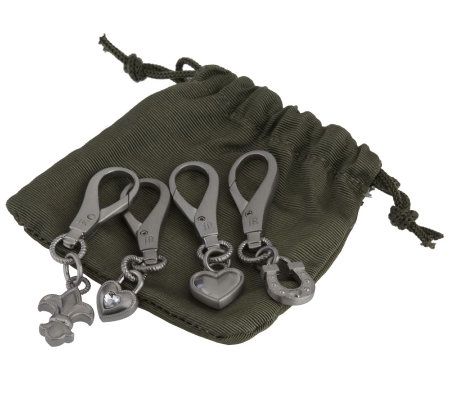 Give your handbag, laptop bag, or suitcase instant style points with this set of four charms. The silvertone charms feature a brushed finish and an engraved Judith Ripka logo. From Judith Ripka.