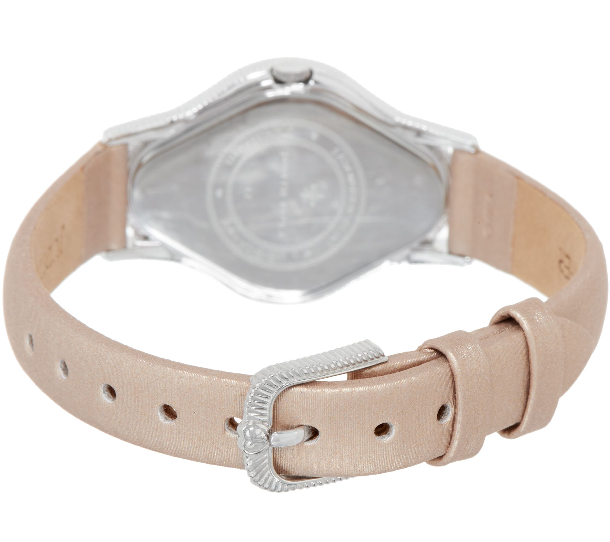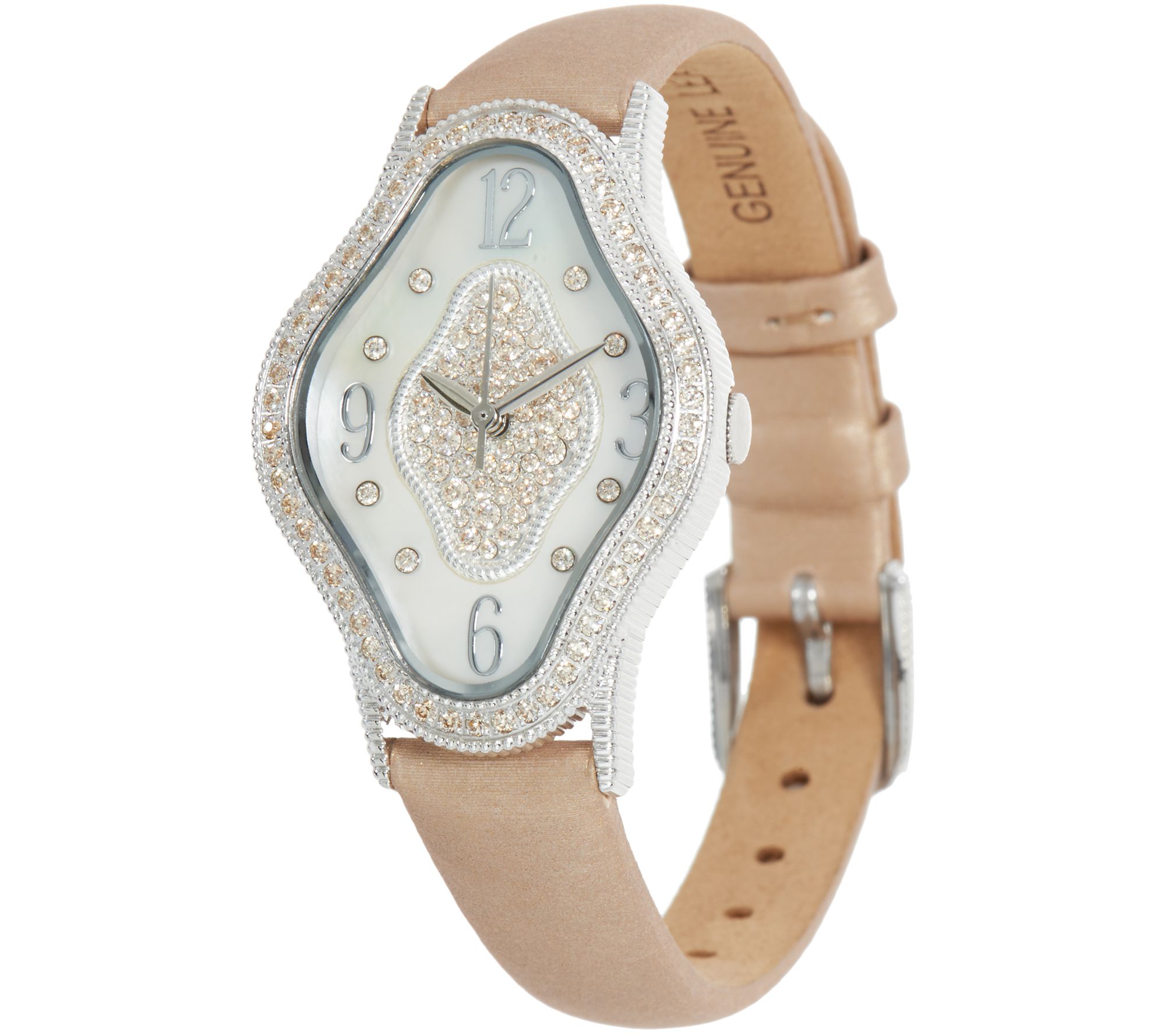 • Hololith diamond-shape mother-of-pearl dial; Arabic hours at 3, 6, 9, and 12; round Diamonique simulated diamonds at other hours and in center; silvertone hour, minute, and second hands