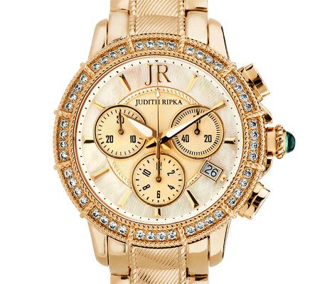 This exquisite timepiece has contrasting textures that include an etched mother-of-pearl dial, polished hour markers, and inset subdials. From Judith Ripka.