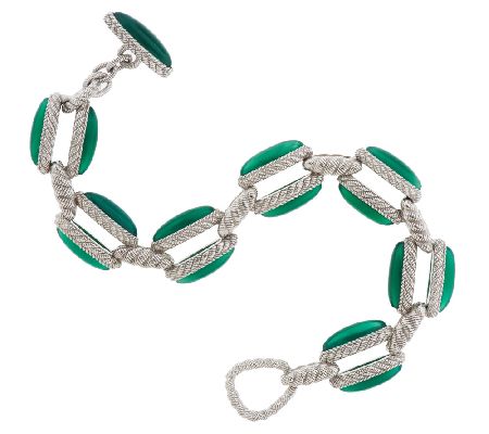 Green lives up to its reputation as the color of envy in this posh piece from Judith Ripka, featuring elongated green chalcedony cabochon links wrapped in textured sterling silver. With textured open links, and closing with a cabochon-accented toggle bar closure, it exhibits a look of luxury from end to end. From Judith Ripka.