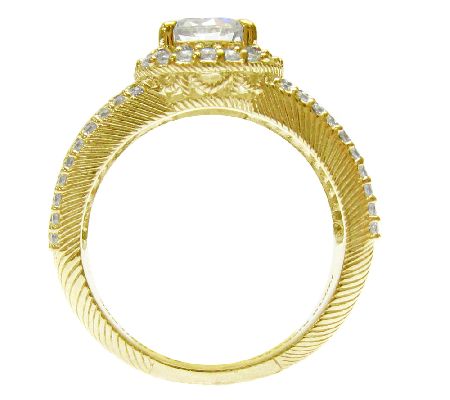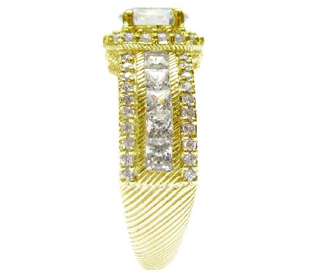 Go out in a blaze of glory wearing this dazzling ring by Judith Ripka, featuring a round center cubic zirconia Diamonique simulated diamond surrounded by a halo of smaller Diamonique(R) simulated diamonds. Set in the 14K gold-clad sterling silver band are a procession of princess-cut Diamonique simulated diamonds and two rows of bead-set sparklers. From Judith Ripka.