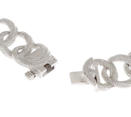 • Graduated interlocking swirl circle links with largest in the center; berge texture with rope motifs; frontal links with prong-set, round, clear, Diamonique simulated diamonds