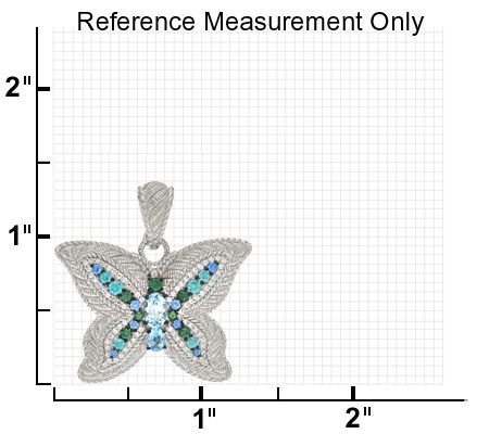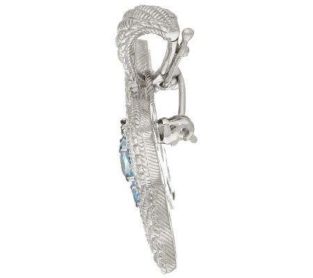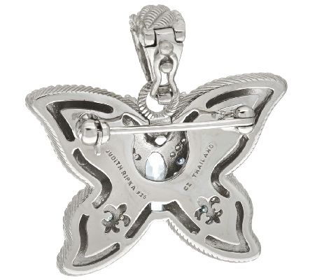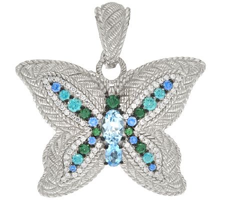 Bring necklaces to life with Judith Ripka's radiant butterfly enhancer. Shimmering with cool, marine tones, this textured sterling silver piece pairs prong-set, oval blue topaz in the center with Diamonique(R) simulated diamonds of light green, green, blue, and clear across the wings. From Judith Ripka.