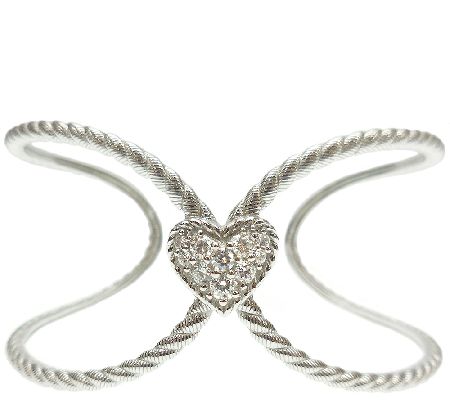 A ticker-inspired trinket. This Judith Ripka bracelet displays a heart-shaped center filled with cubic zirconia Diamonique(R) simulated diamonds. Done in sterling silver, the openwork cuff design is enhanced by twisted berge textures. From Judith Ripka.