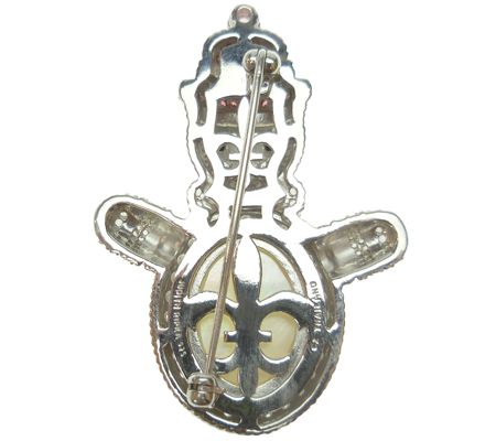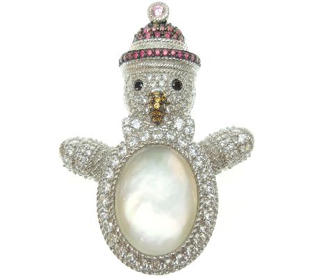 • Snowman design; belly is a doublet with a rock-crystal quartz top and a white mother-of-pearl base; snowman has round Diamonique simulated diamonds in clear and dark pink for the hat, bezel-set light pink for the hat's top, bezel-set black eyes, and a golden nose; golden and dark pink Diamonique simulated diamonds are set in black rhodium