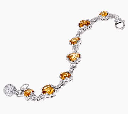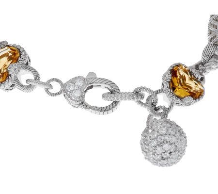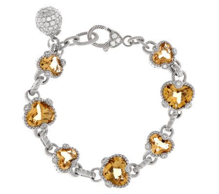 She hearts Judith Ripka. For yourself or your favorite someone, this lovely sterling silver bracelet--with stations of heart-shaped champagne quartz gemstones--really shows your love. Bezel-set Diamonique(R) simulated diamonds add a brilliant accent to the prongs of the quartz stations, while a dainty, dangling charm sparkles with pave-set Diamonique simulated diamonds. From Judith Ripka.