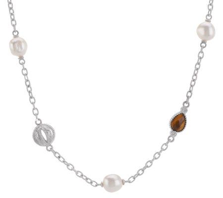 Organic elegance. Icy cool sterling silver is warmed to life with rich-hued tiger's eye and freeform cultured freshwater pearls. Of course, the Diamonique(R) simulated diamonds add that just-right, upscale shine. From Judith Ripka.