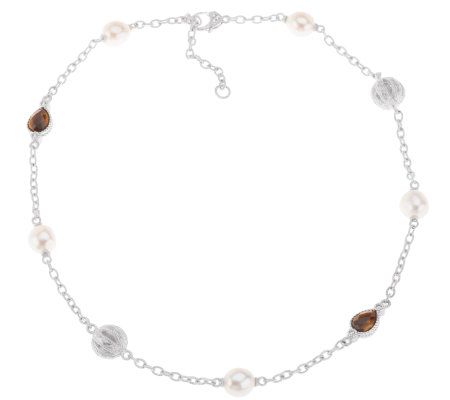 • Textured oval links with alternating stations of bezel-set pear-shaped faceted tiger's-eye, freeform white cultured freshwater pearls, and openwork truffle beads with braided details; bezel-set Diamonique simulated diamonds on either side of tiger's-eye; adjustable length