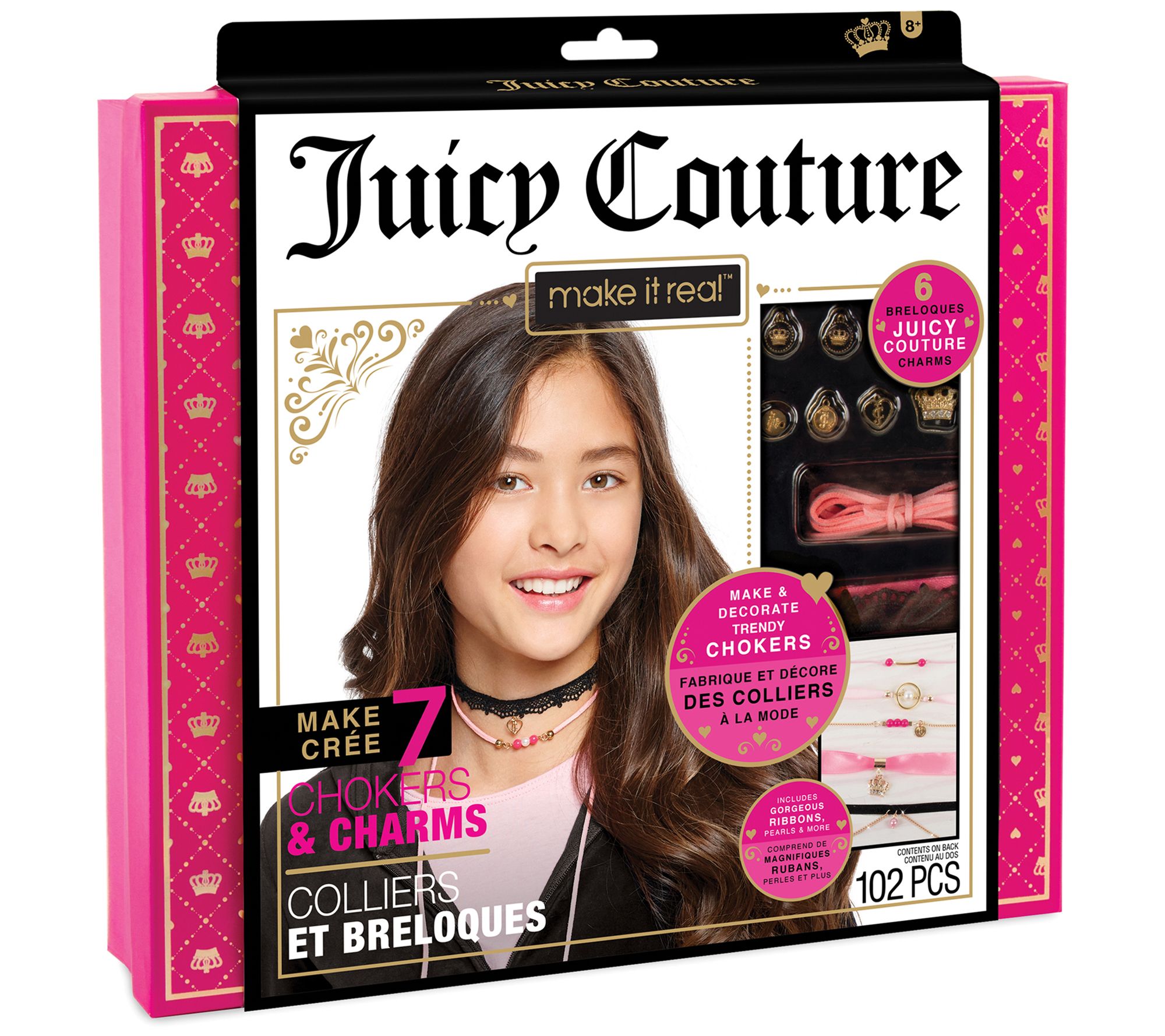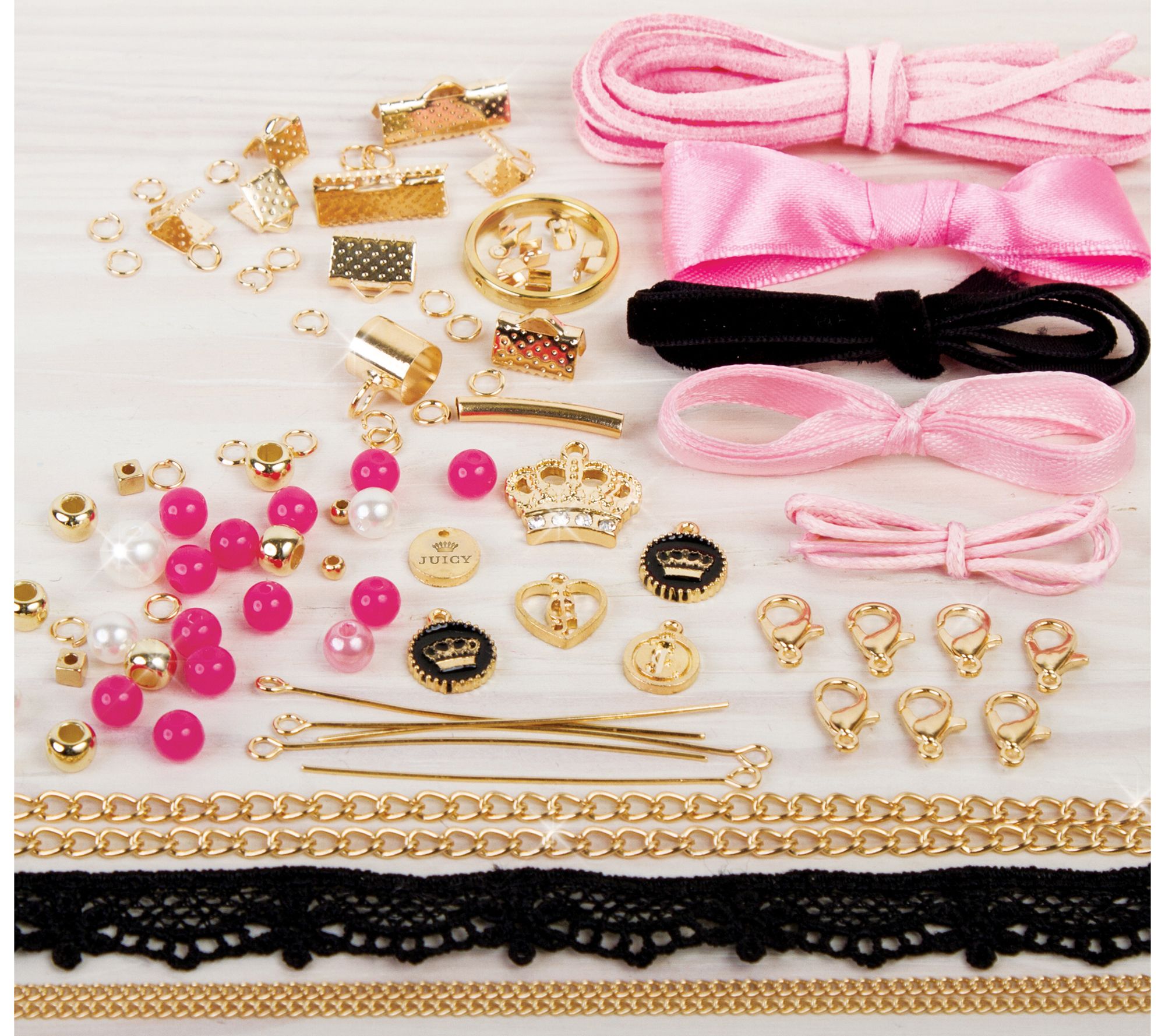 • Includes six Juicy Couture charms, 60 metallic pieces, 25 beads, faux-suede lace, velvety ribbon, stain ribbon, lace ribbon, waxed cord, chains, and instructions