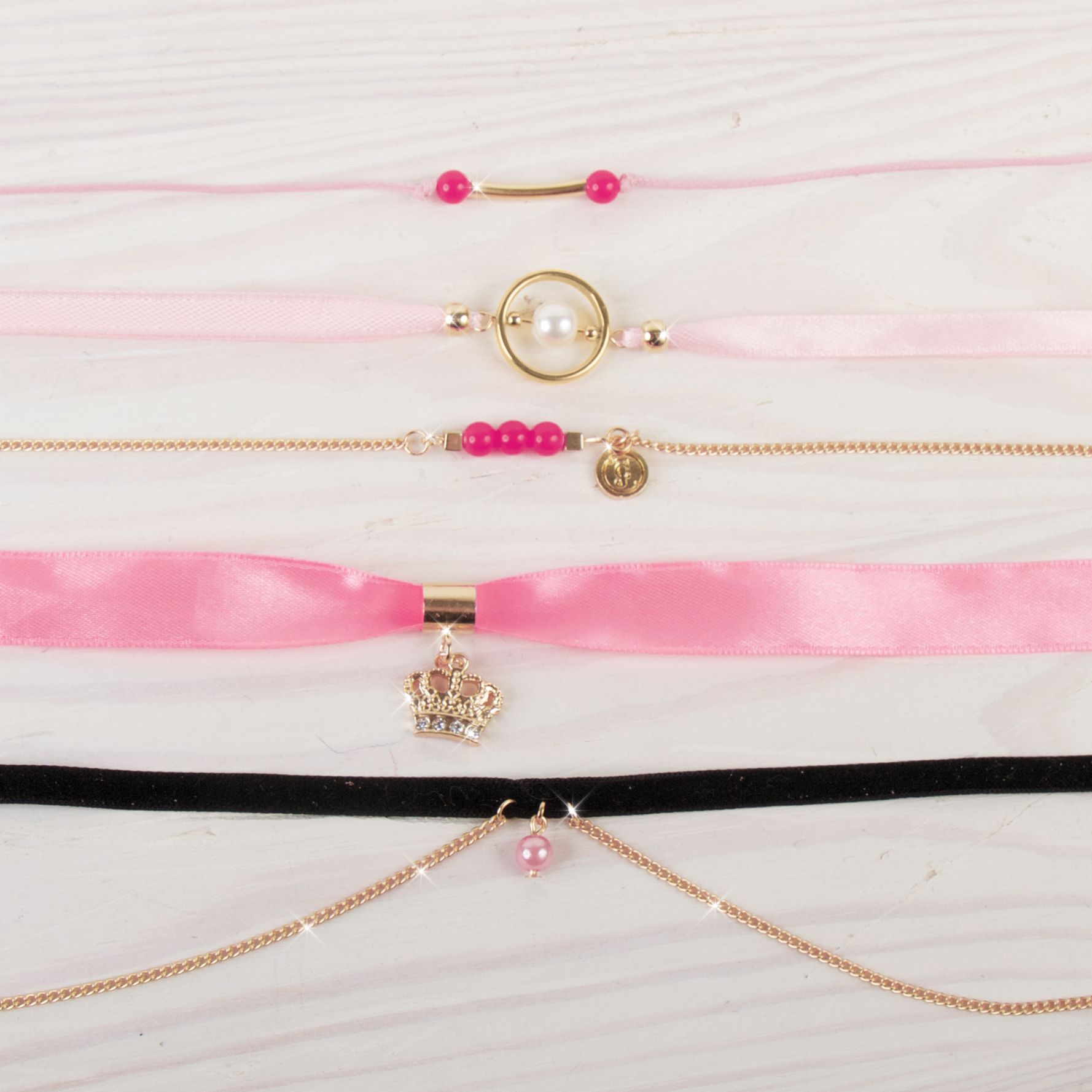 Equipped with ribbons, chains, beads, and baubles, fashionistas-in-training can have fun designing seven unique elastic necklaces with a glam twist. From Juicy Couture.