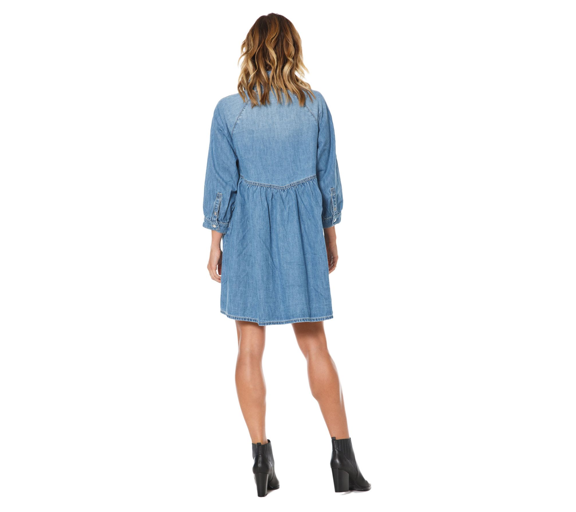 • Features: mock neckline, 3/4 sleeves, pockets, above-the-knee length