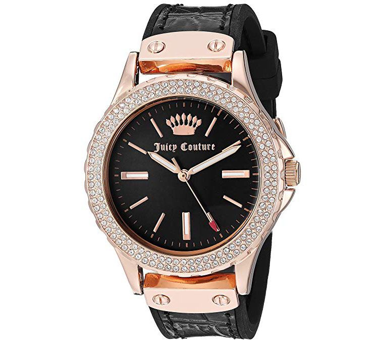 It's a go for glam time whenever you wear this black and rosetone watch with crystal accents around the dial. From Juicy Couture.