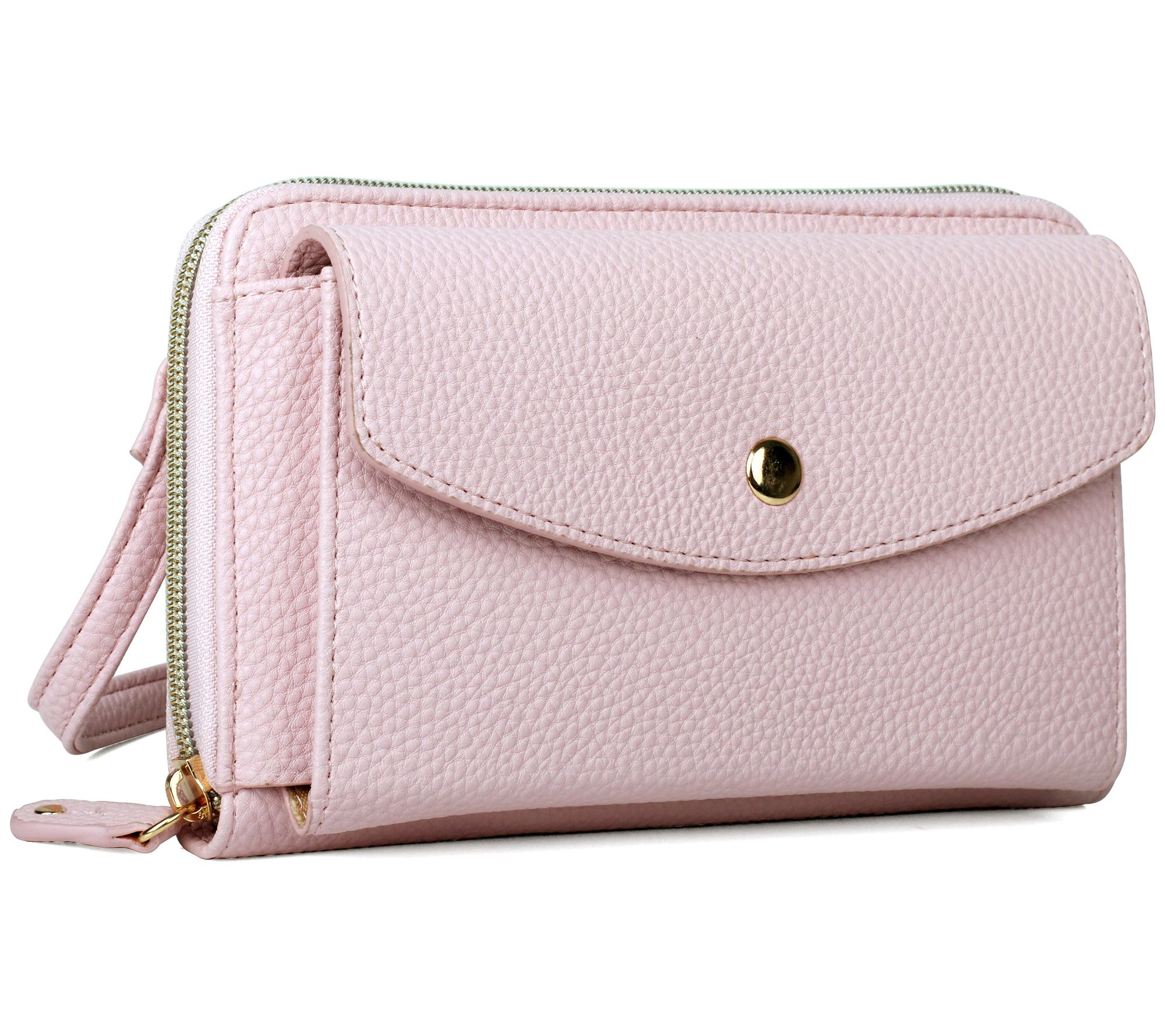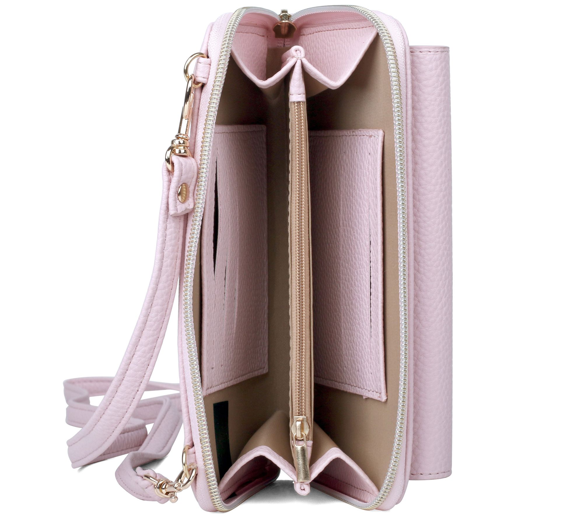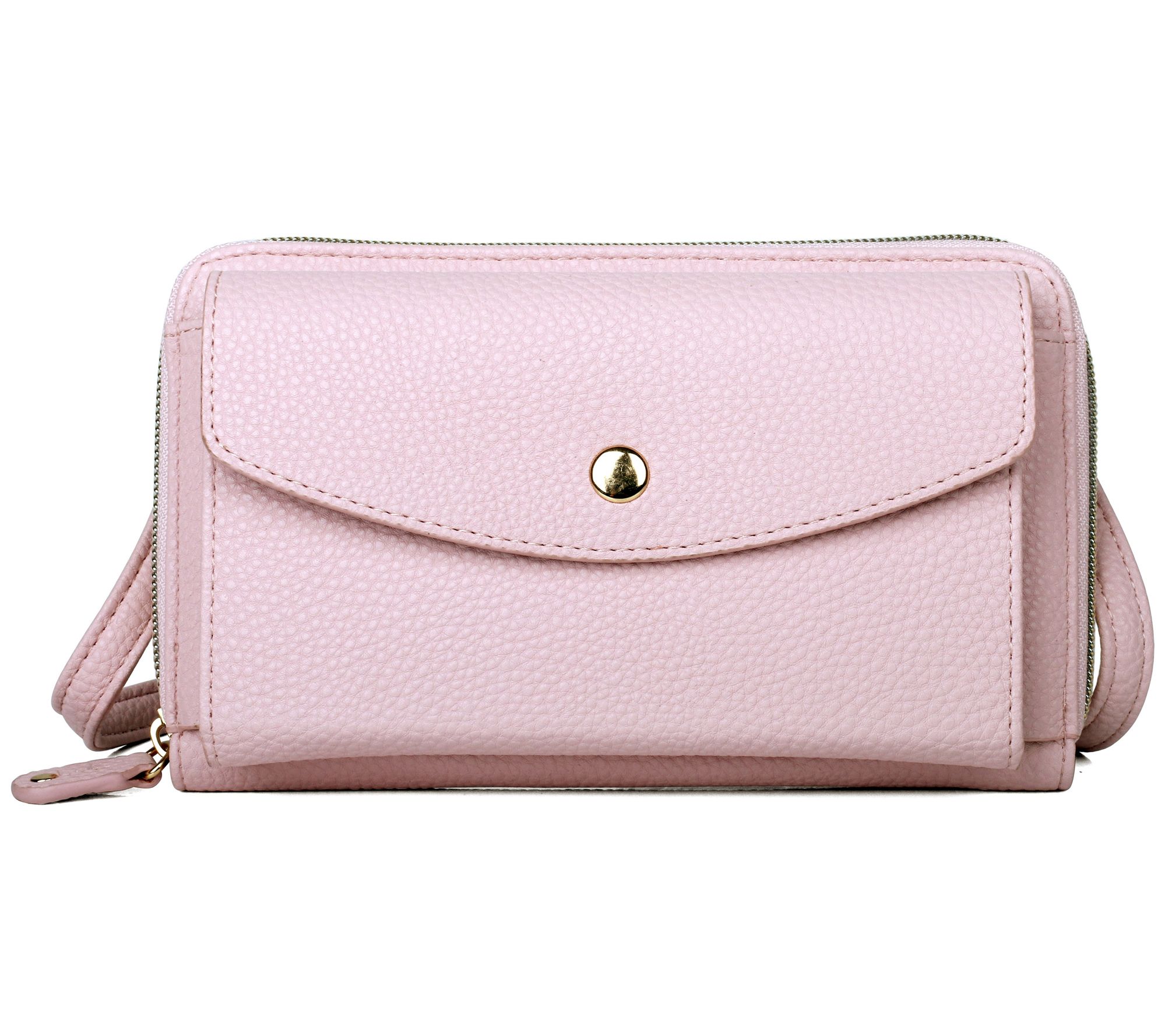 • Zip-around closure, RFID-block lining, eight card slots, inner zip pocket, front phone pocket with flap, adjustable/detachable shoulder strap, goldtone hardware
