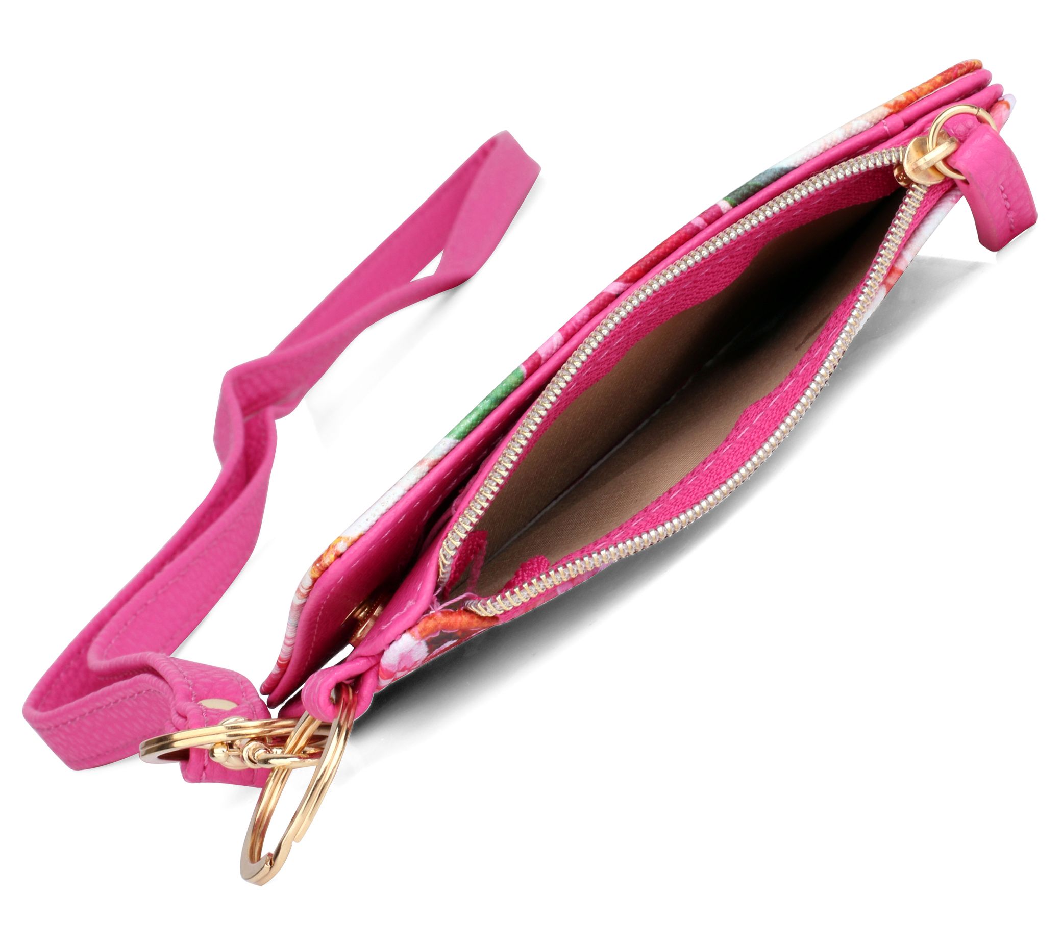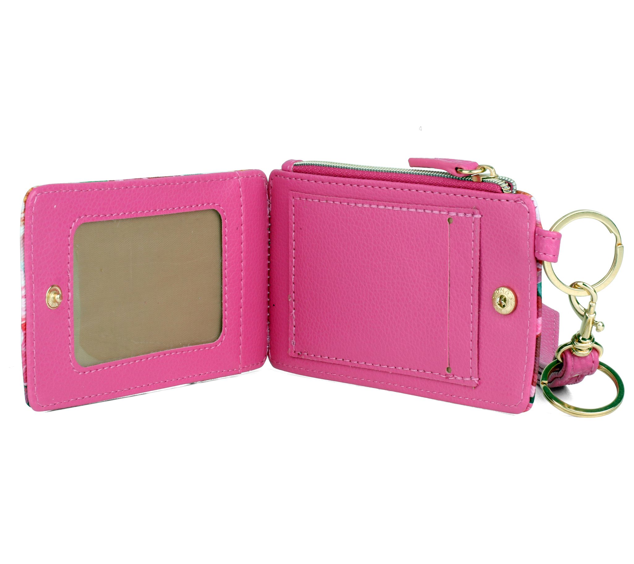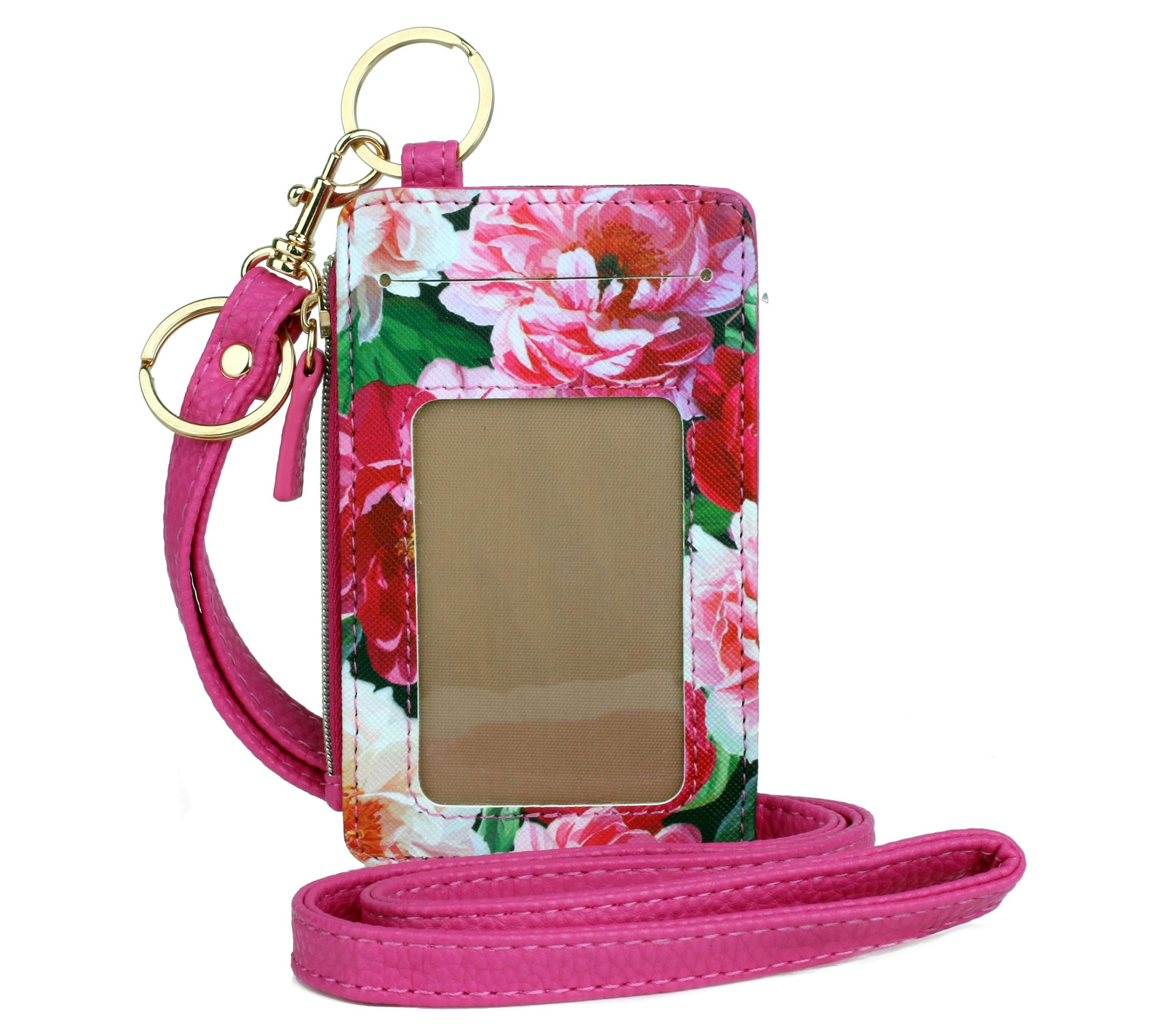 • Removable strap, snap closure, floral print, two ID windows, zip pocket, two key rings