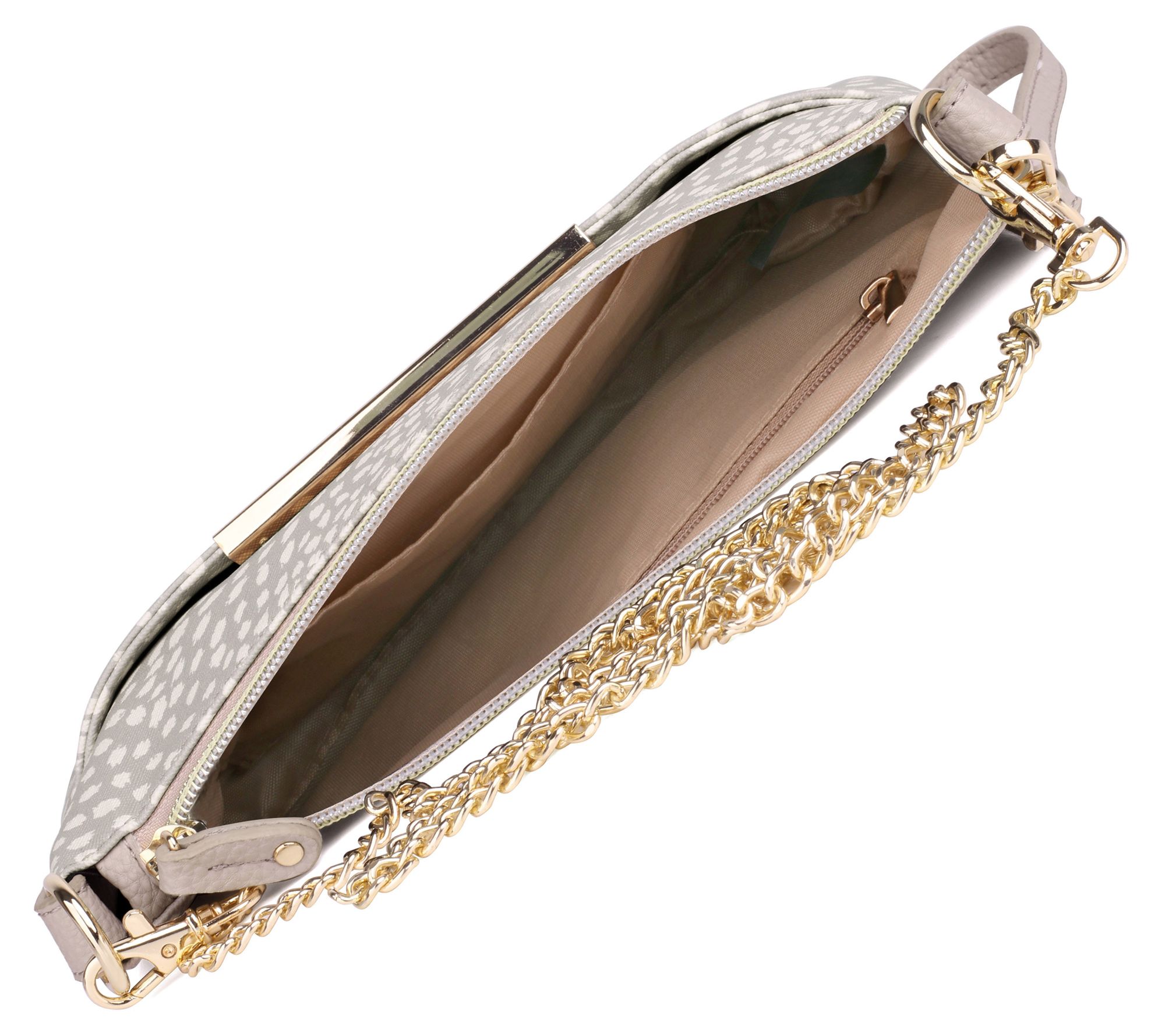 • Detachable chain crossbody strap, detachable wristlet strap, zip top closure, one zip pocket, goldtone hardware