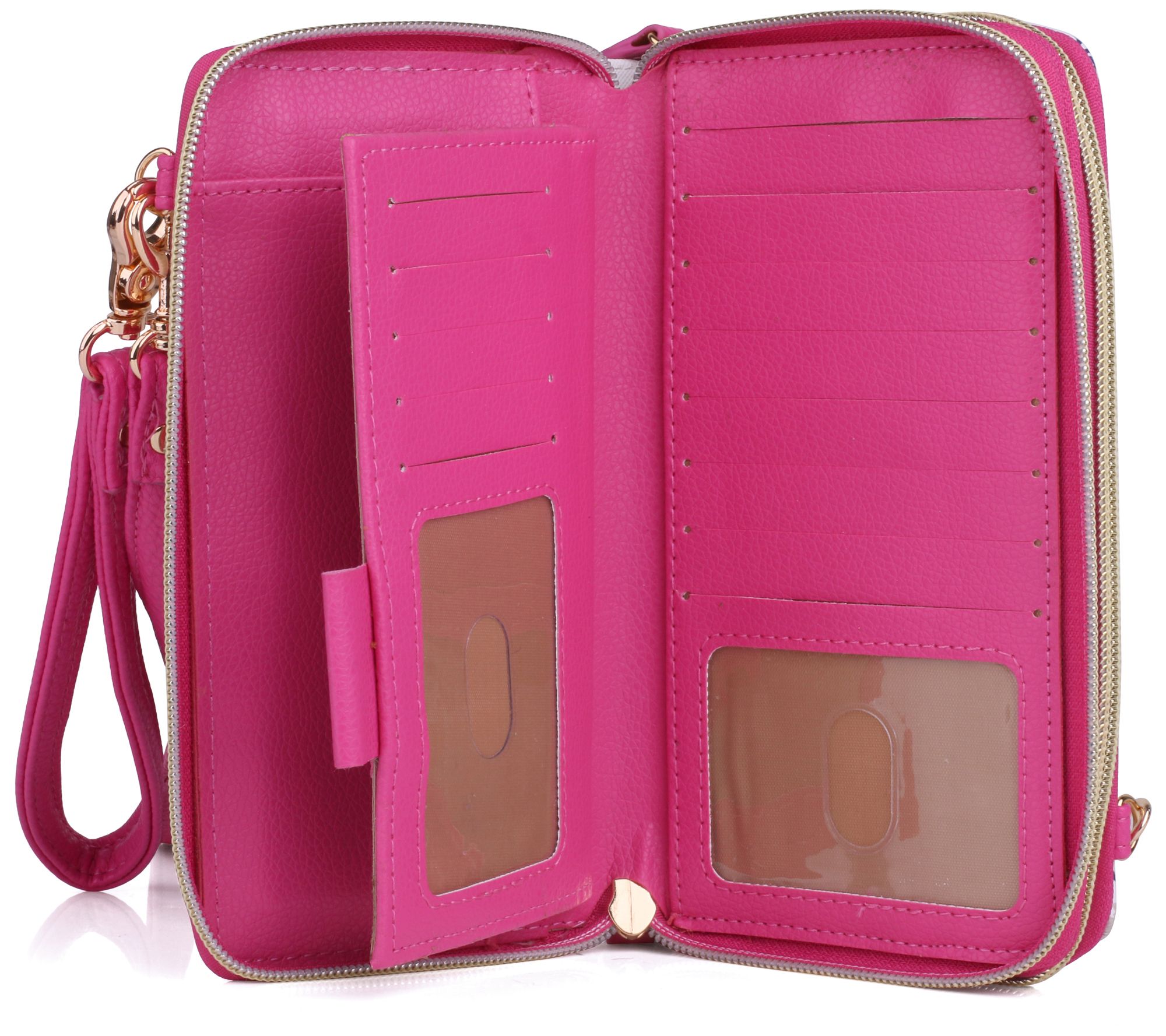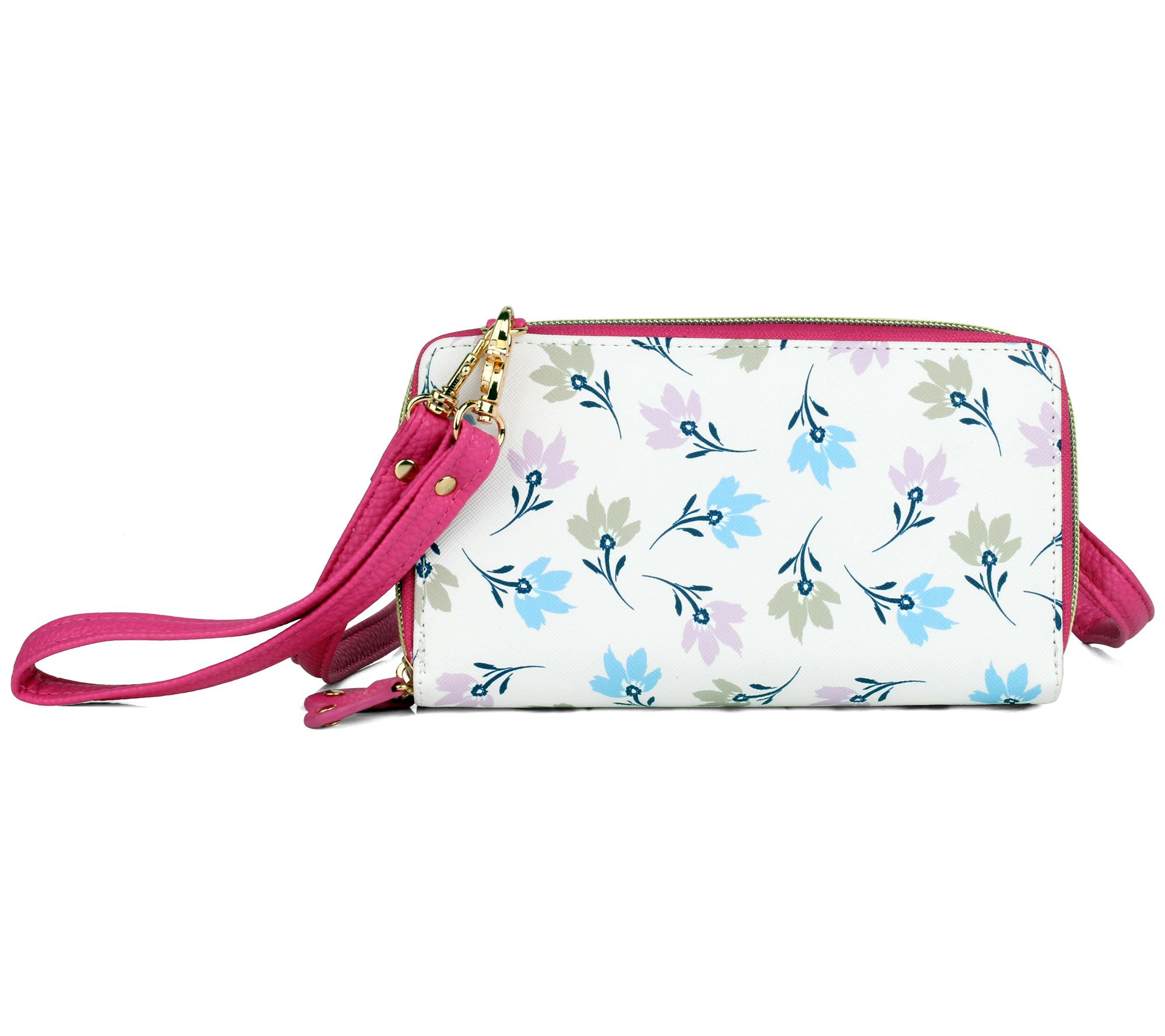• Single handle, detachable shoulder strap, two zip-around compartments, exterior slip pocket, 11 credit card slots, removable checkbook and pen holder, two idea windows, interior pockets