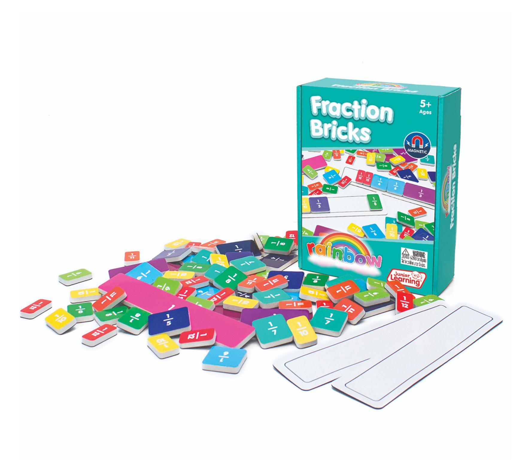 • Color-coded, magnetic bricks represent whole, half, third, quarter, fifth, sixth, eight, tenth, and twelfth fractions
