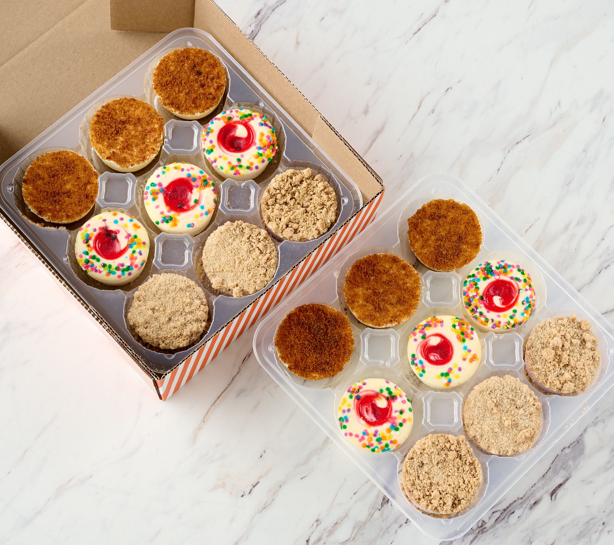 Each shipment includes 18 4-oz mini swirl cheesecakes; future shipments arrive in June and November for a total of three shipments