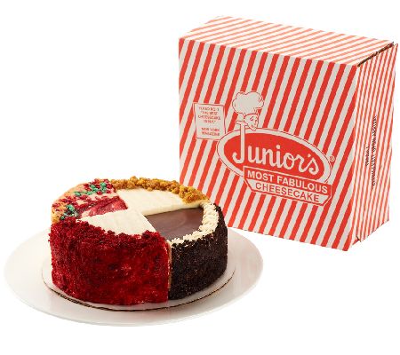 Includes 7"Diam holiday cheesecake sampler: one quarter each in strawberry swirl Christmas cheesecake with strawberry puree and holiday chips; red velvet cheesecake layer cake with cream cheese frosting; pumpkin spice cheesecake layer cake with cinnamon and cream cheese frosting; and chocolate dream cheesecake layer cake with white chocolate cheesecake and dark chocolate cake