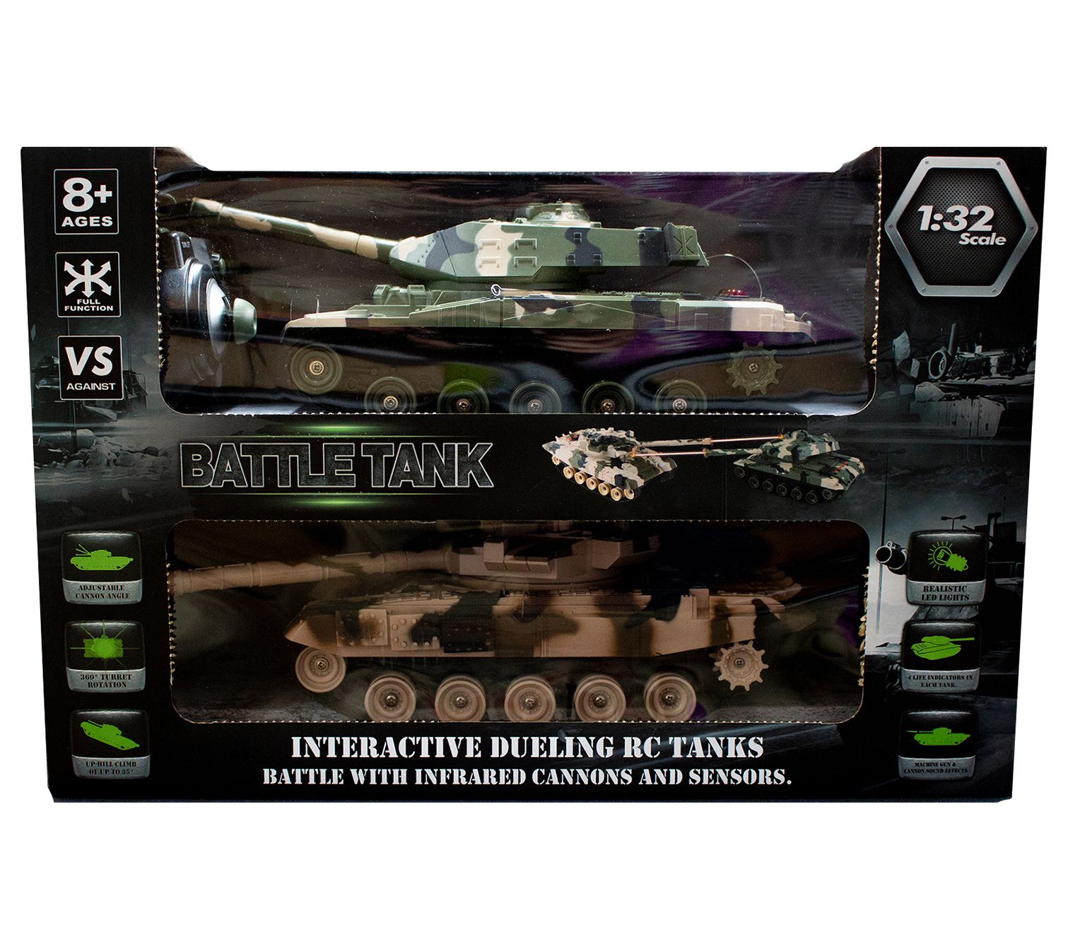 • Infrared sensors, light and sound effects, controllable turret, and built-in battle game